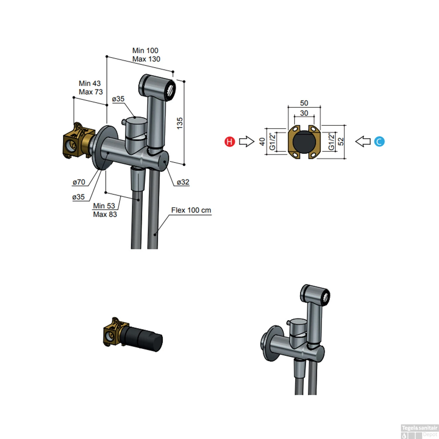 Specificaties Afbouwdeel Bidetmengkraan Hotbath Cobber Met Doucheslang En Houder Mat Zwart