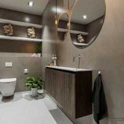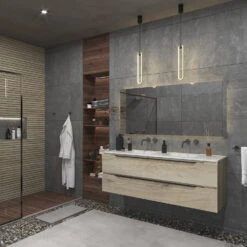 Het Madrid badkamermeubel is van ons eigen merk Boss & Wessing en is een stijlvolle toevoeging aan uw badkamerruimte. Het meubel wordt standaard geleverd met een onderkast en een bijpassende wastafel. De onderkast heeft een breedte van 120 cm, een diepte van 45 cm en een hoogte van 30 cm en dient aan de muur bevestigd te worden. De kast is gemaakt van melamine en afgewerkt in een fraaie ‘washed oak’ kleur. De onderkast is uitgerust met twee lades waarin u diverse badkamerartikelen kwijt kunt.
