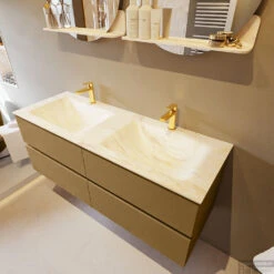 Bovenop de onderkast bevestigt u de inbouw wastafel. Deze wastafel is wit van kleur en is gemaakt van solid surface. Solid surface is uitstekend geschikt om sanitaire producten van te maken omdat het geen poriën en naden heeft. Solid Surface is een composiet, geproduceerd uit mineralen en harsen. Bovendien is dit materiaal bestendig tegen vocht, vlekken, en zelfs chemische stoffen. Er trekt dus niets in, het is niet poreus, heeft een intense kleur én is gemakkelijk schoon te houden.