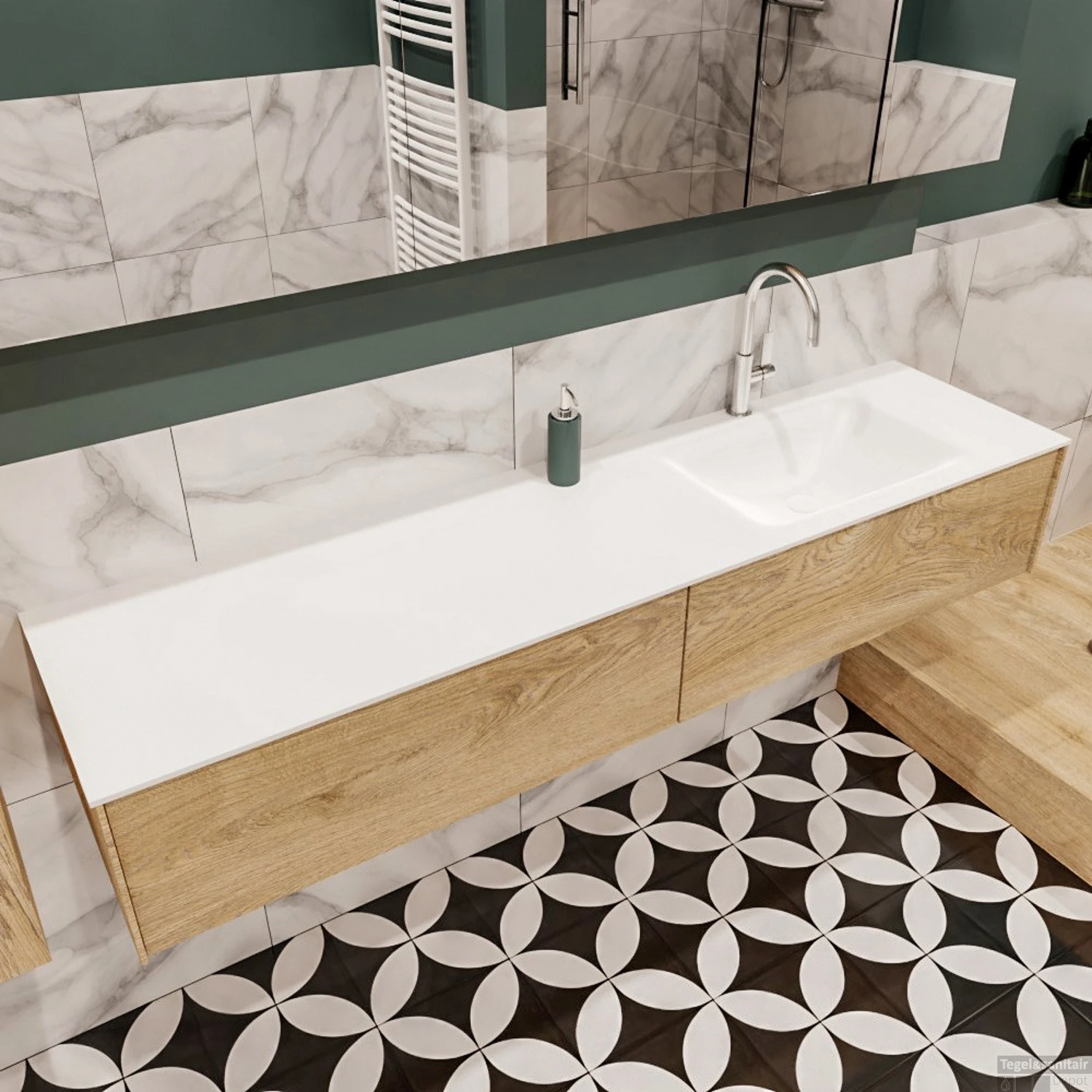 Badkamermeubel BWS Madrid Washed Oak 180x45x30 cm Mat Witte Solid Surface Wastafel Rechts (2 lades, 1 kraangat)