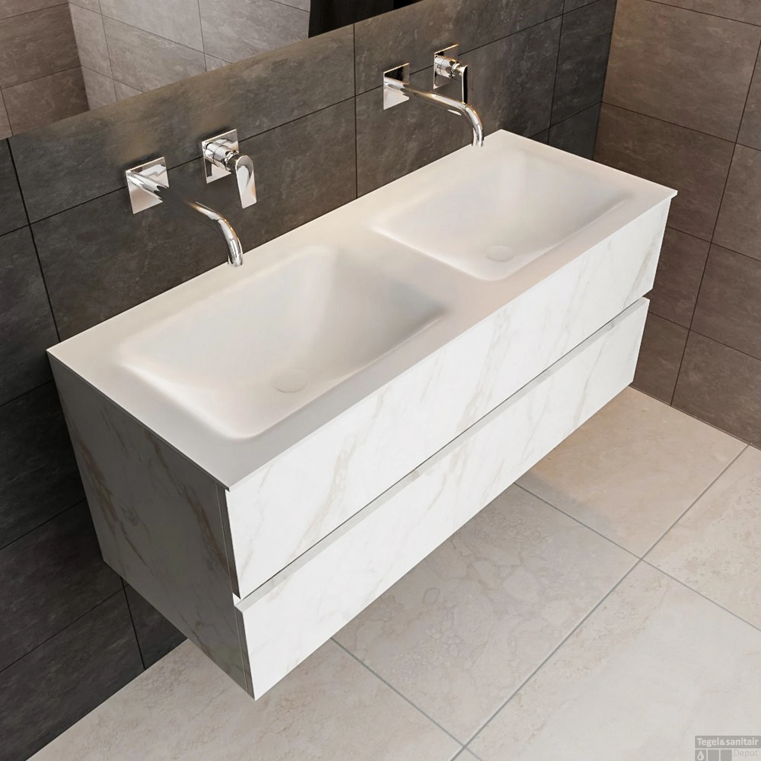 Badkamermeubel BWS Valencia Carrara Mat 120 cm Solid Surface Wastafel Dubbel (0 kraangaten, 2 lades)
