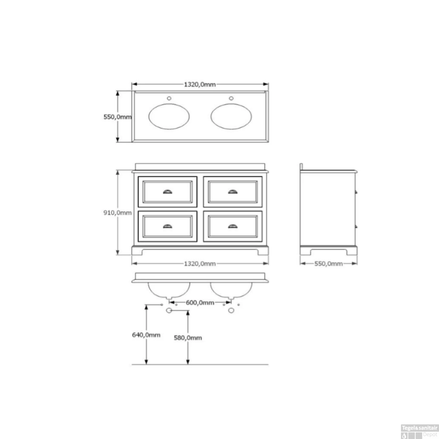De onderkast heeft 4 lades.