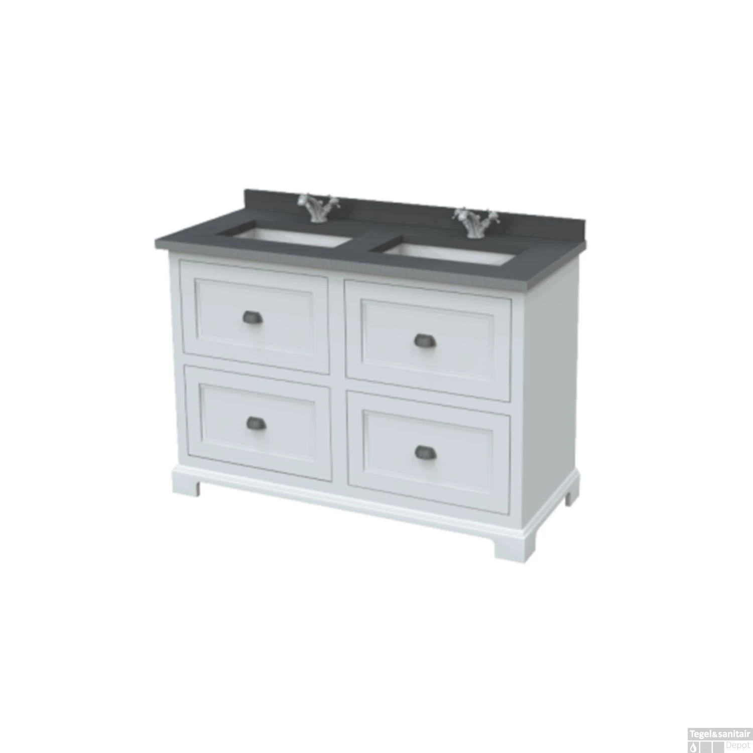 De set bestaat uit een badmeubel incl. wastafel, granieten blad, keramische ovale onderbouw wastafels en granieten opzetplinten.