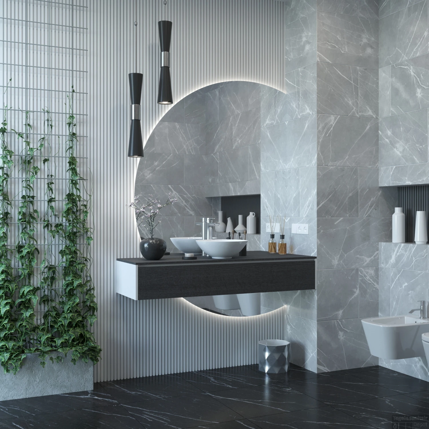 De spiegel bestaat uit twee delen. Deze kunt u om het wastafelmeubel heen plaatsen, waardoor het lijkt alsof het meubel zweeft op de spiegel.