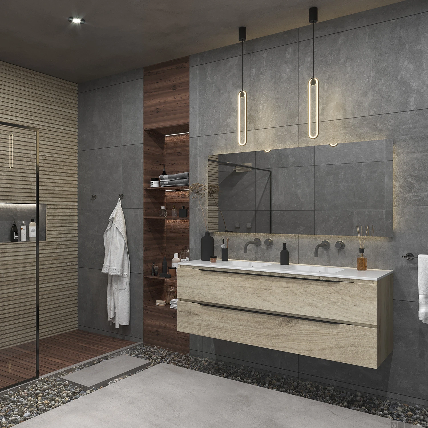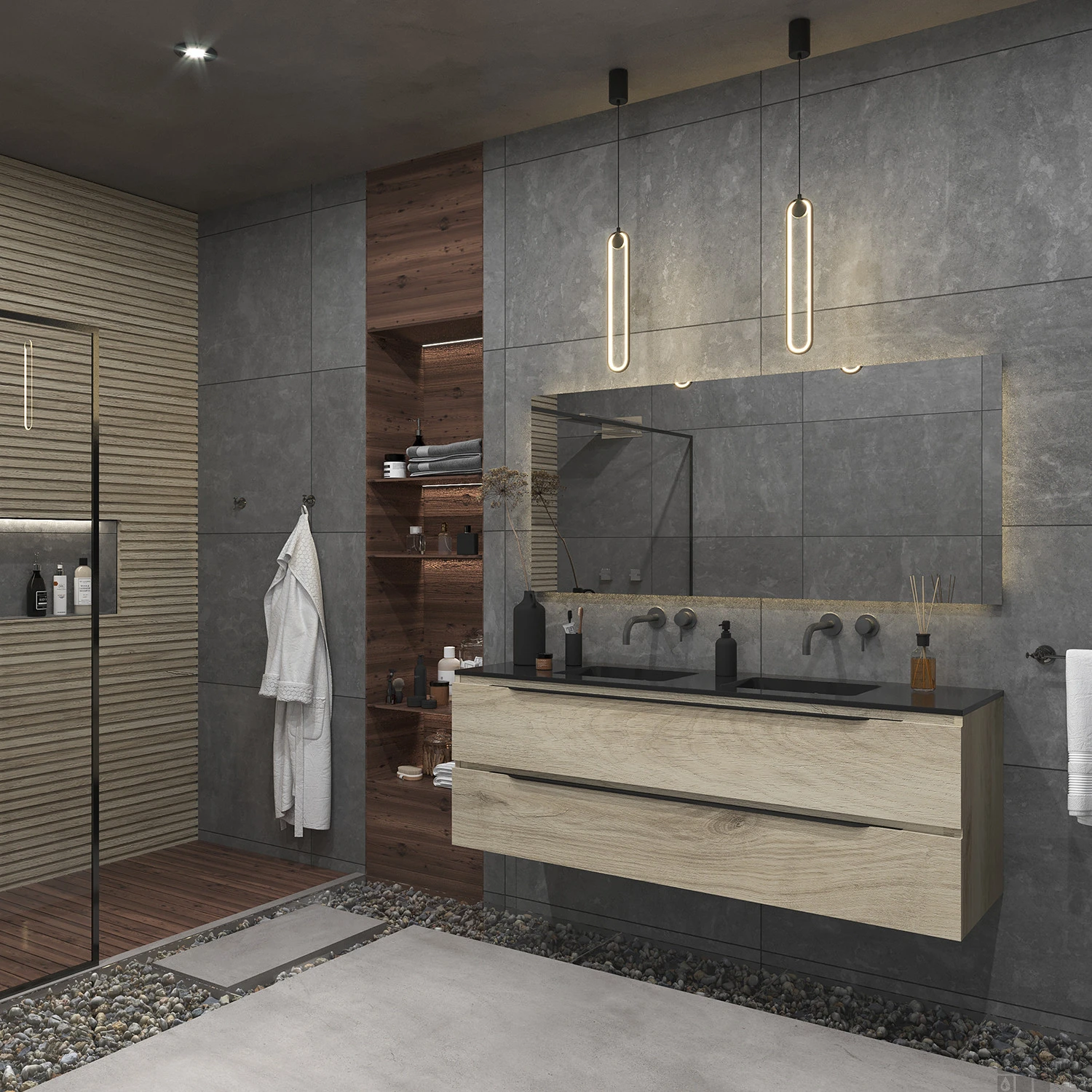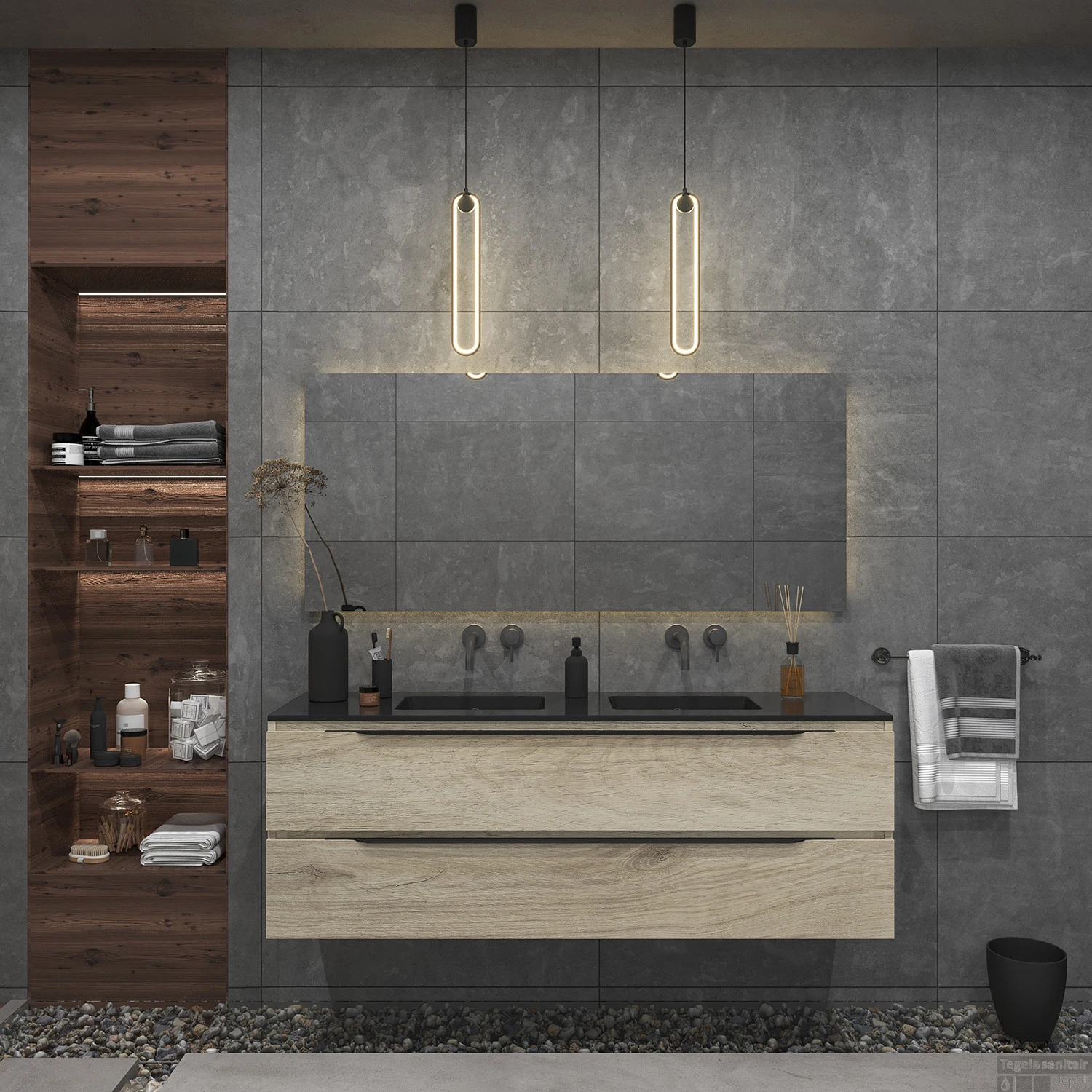 Specificaties Badkamermeubelset Gliss Design Hera Mat Zwart 200cm 4 Laden Licht Grijs Eiken (Keuze Wastafel):