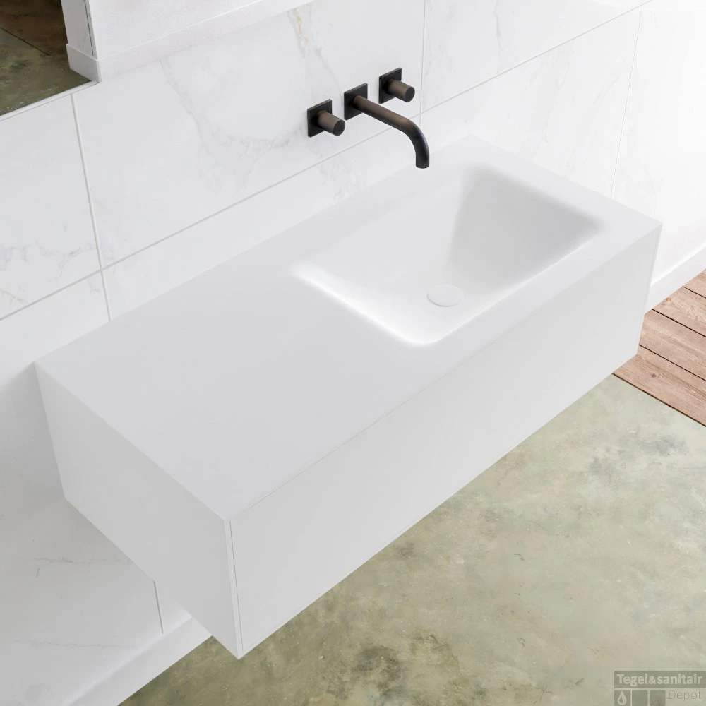 Het hangende badkamermeubel is gemaakt van solid surface. Dit meubel is 100 cm lang en heeft 1 lade die greeploos is. De lade kan worden geopend met een push-2-open systeem. De panelen zijn naadloos met elkaar verlijmd. Dit zorg voor een strakke en stijlvolle afwerking van uw badkamer.