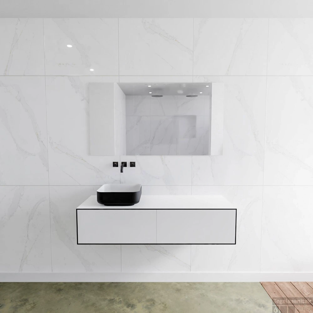 Badkamermeubelset Mondiaz LAGOM 130 cm Topblad met Linkse Wastafel Solid Surface Opzetkom Binx Zonder Kraangaten Mat Zwart (2 laden)