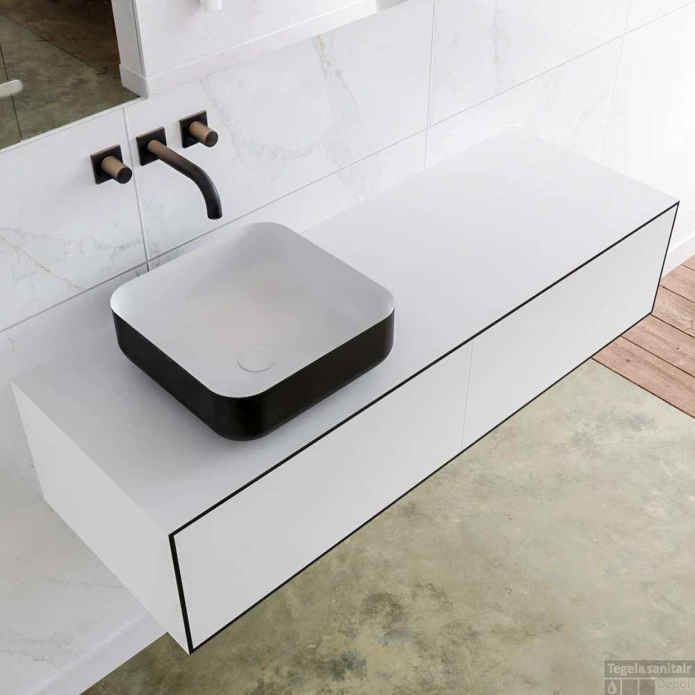 De wastafel is een opzetkom in model Binx met kraangat en is gemaakt van solid surface.