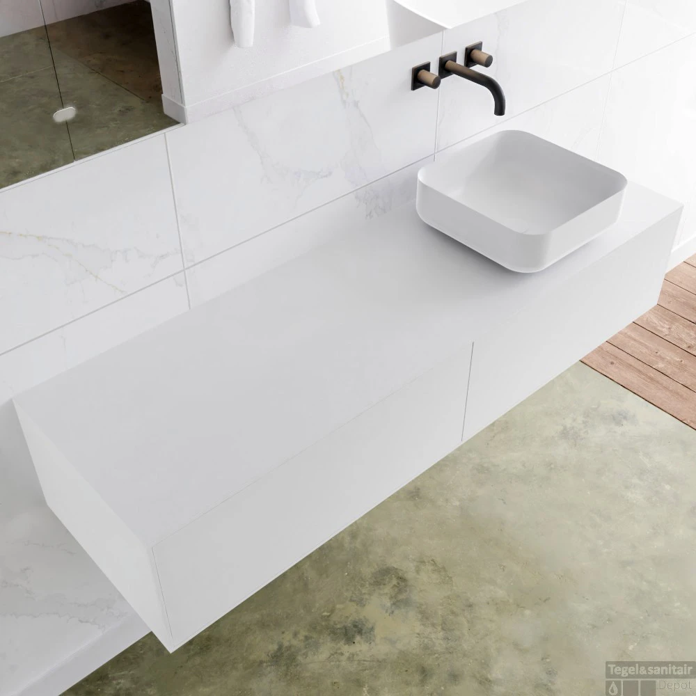 De wastafel is een opzetkom in model Binx zonder kraangat en is gemaakt van solid surface.