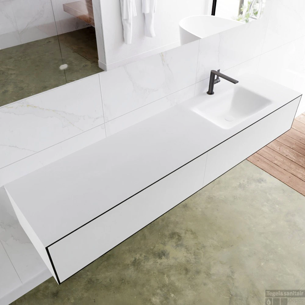 Het hangende badkamermeubel is gemaakt van solid surface. Dit meubel is 190 cm lang en heeft 2 lades die greeploos zijn. De lades kunnen worden geopend met een push-2-open systeem. De panelen zijn naadloos met elkaar verlijmd. Dit zorg voor een strakke en stijlvolle afwerking van uw badkamer.