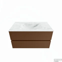 Het hangende badkamermeubel is gemaakt van solid surface. Dit meubel is 90 cm lang en heeft 1 lade die greeploos is. De lade kan worden geopend met een push-2-open systeem. De panelen zijn naadloos met elkaar verlijmd. Dit zorg voor een strakke en stijlvolle afwerking van uw badkamer.