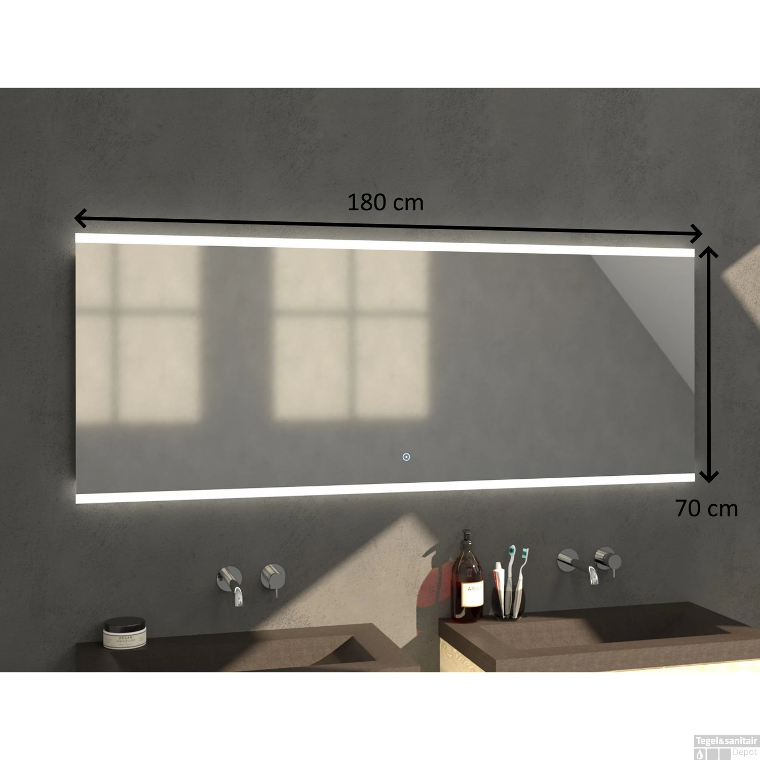 De Twinlight badkamerspiegel is van het merk Sanitop en staat garant voor kwaliteit en design. De spiegel heeft een breedte van 180 cm, een hoogte van 70 cm en een glasdikte van 3 cm. Verder is de Twinlight voorzien van geïntegreerde LED-verlichting. De horizontale verlichting bevindt zich aan de boven- en onderzijde van de spiegel. De verlichting wordt eenvoudig aan- en uitgeschakeld met behulp van de sensor die zich aan de onderzijde bevindt. De badkamerspiegel is eenvoudig aan de wand te monteren en is daardoor makkelijk in onderhoud.