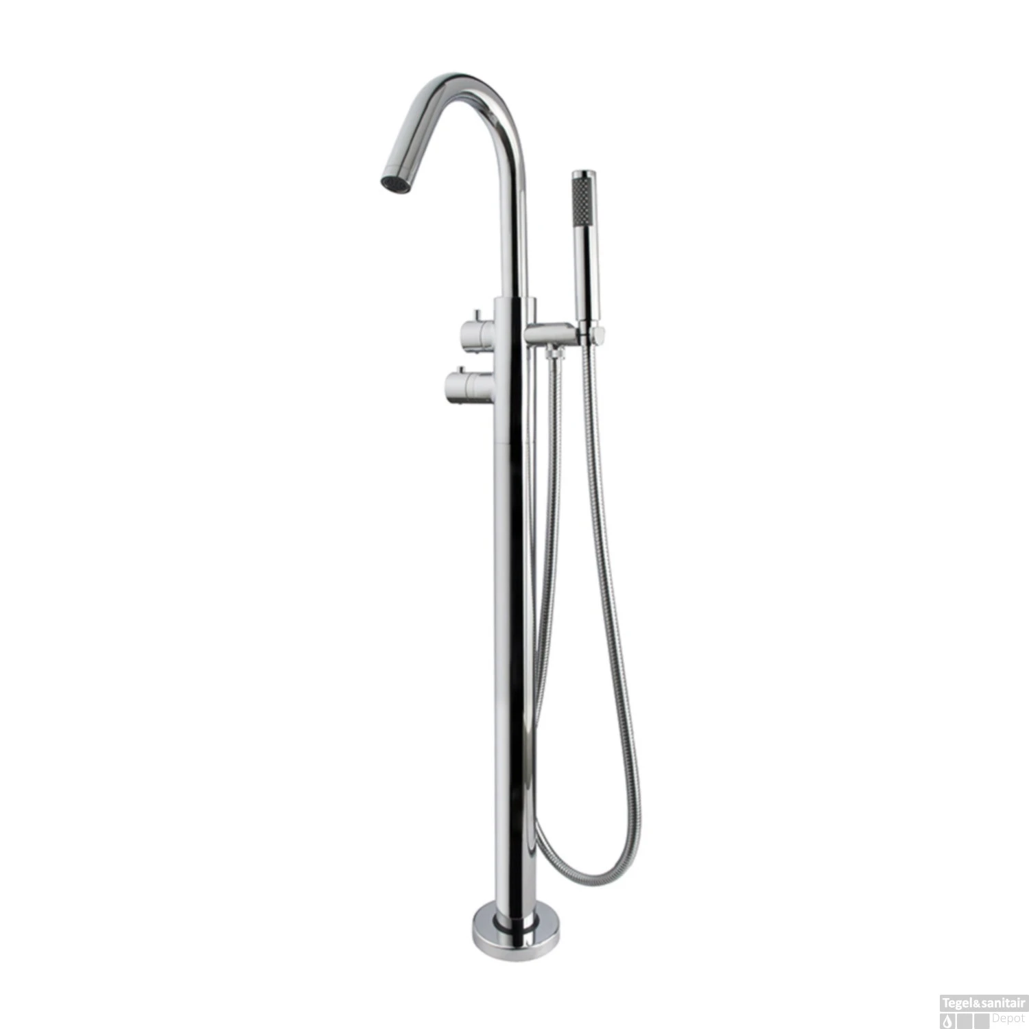 Deze vrijstaande Caral badkraan is van het populaire merk Wiesbaden en staat garant voor kwaliteit en design. Het betreft een complete set bestaande uit een badkraan, een handdouche en een doucheslang. Alle elementen van deze set zijn afgewerkt in de kleur glanzend chroom, wat een luxe uitstraling aan uw badkamer geeft.