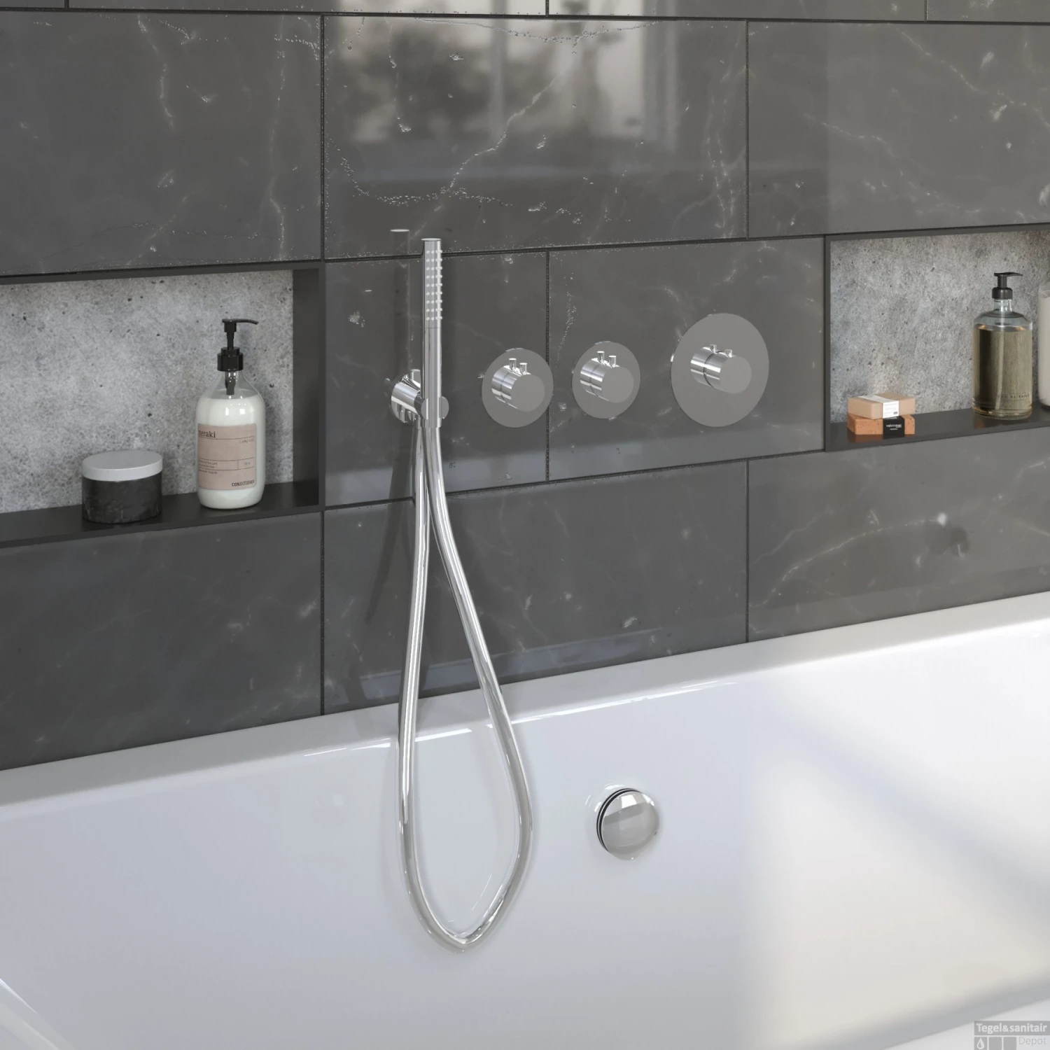 De set wordt geleverd met thermostatische badkraan, 2 stopkranen, badvul overloop, muuruitlaat, doucheslang en handdouche. Daarnaast heeft u de optie een alternatieve handdouche, doucheslang of muuruitlaat te kiezen, eventueel voor een meerprijs.