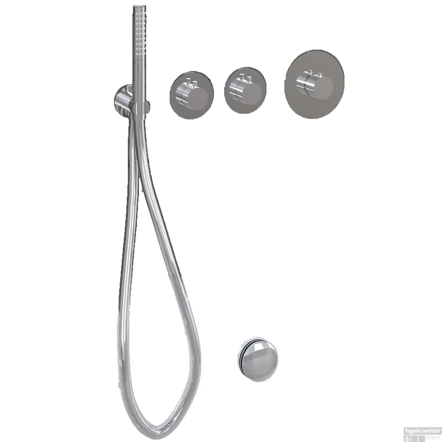 De handdouche heeft één stand en heeft een lengte van 21 cm. De doucheslang heeft een lengte van 150 cm en heeft een glad oppervlak. Daarnaast heeft de thermostatische badkraan een diamter van 13.8 cm en zijn de stopkranen 9 cm in diameter. Alle drie de kranen zijn voorzien van een ronde knop. De inbouwbox van de badkraan is 15.25 cm diep en de inbouwbox van de stopkranen is 15.1 cm diep.