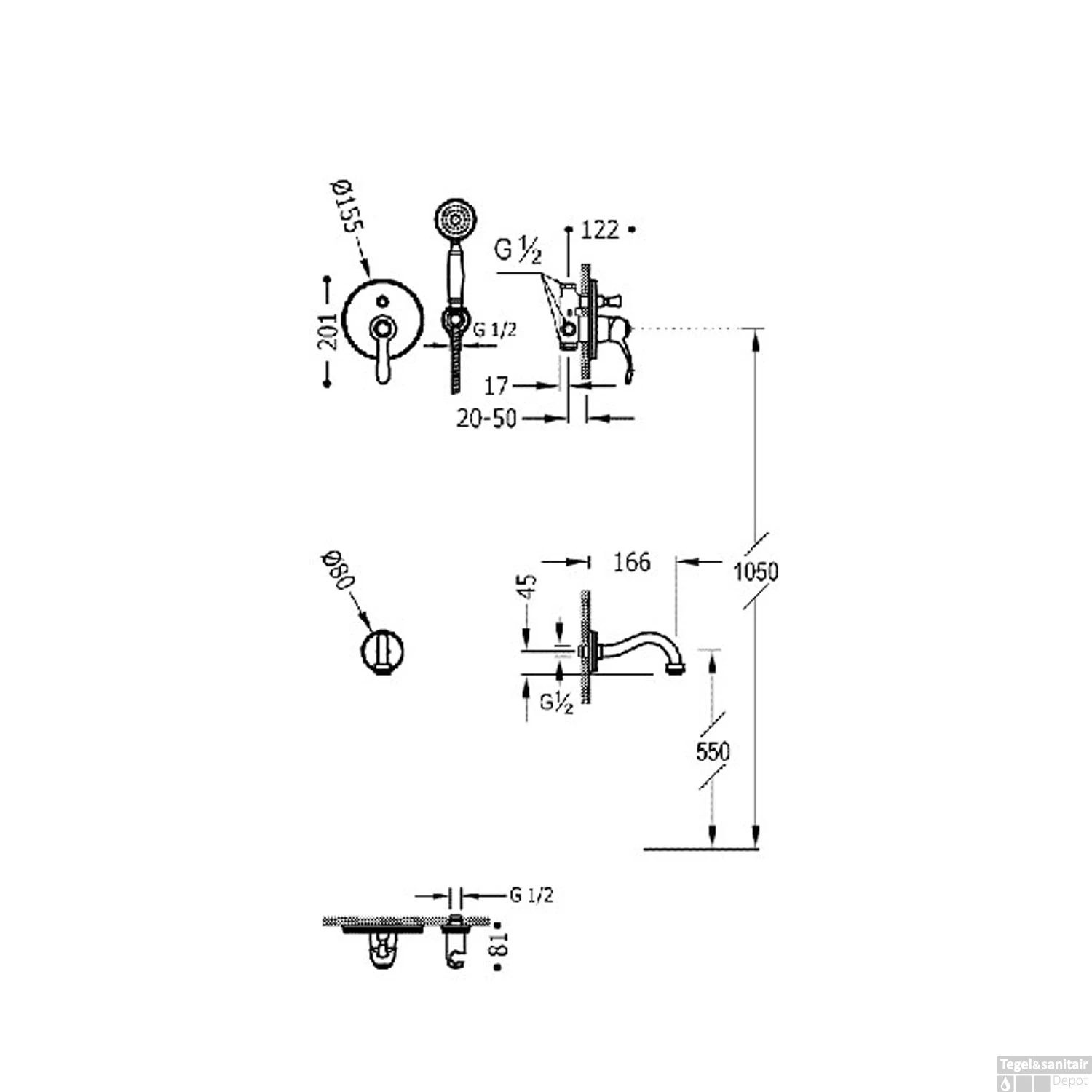 Specificaties Badmengkraan Tres Clasic Inbouw Set Incl. Handdouche Verouderd Messing: