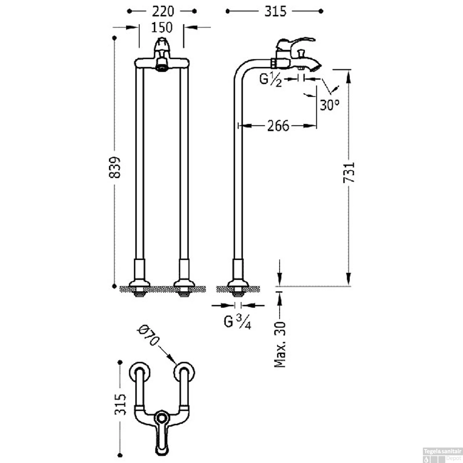 - Uitloop kraan: 31.5 cm