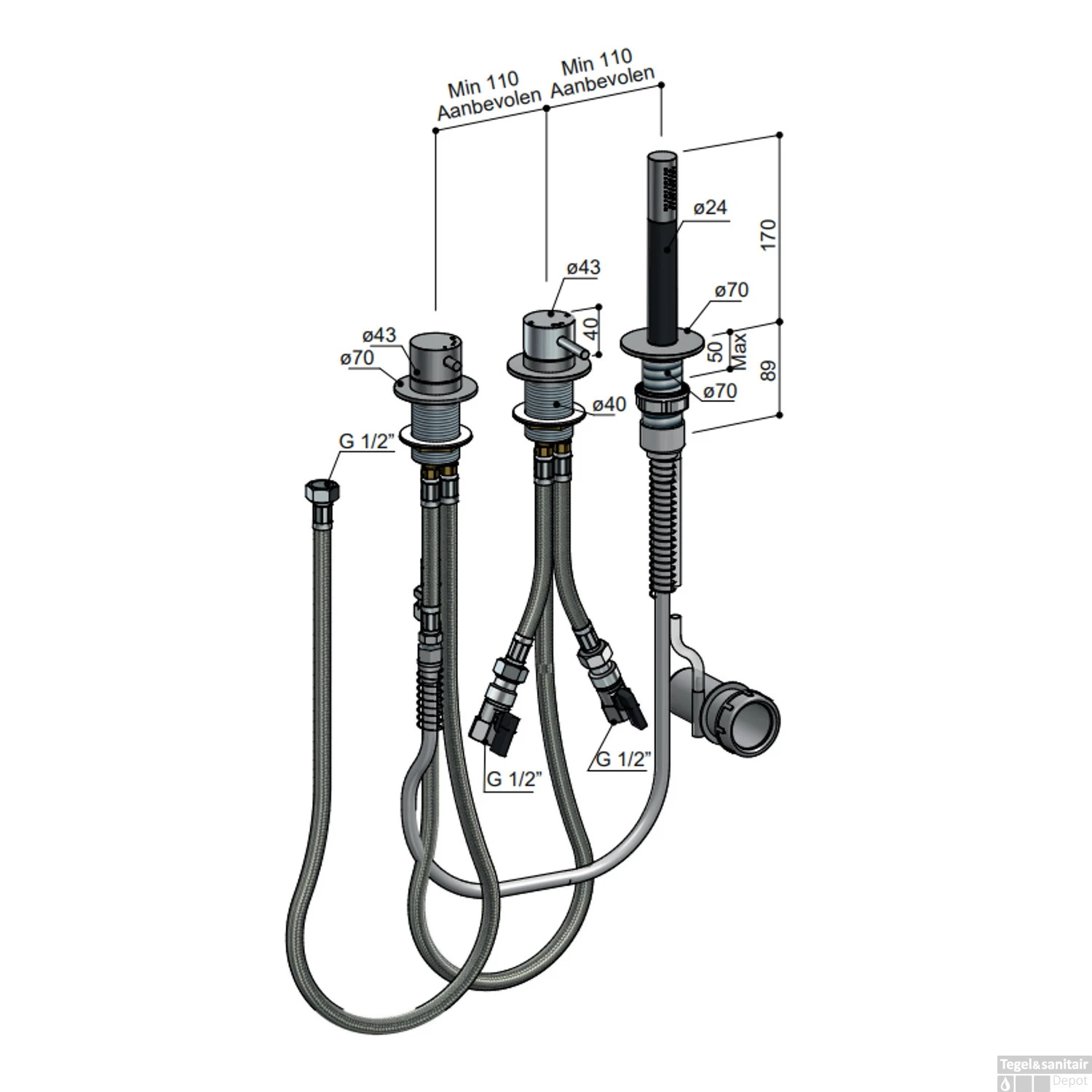 Tussen de uitloop, handdouche, omstelknop en mengkraan wordt een afstand van minimaal 11 cm geadviseerd. Deze afstand kan echter ook groter zijn. Op die manier kunt u de kraan plaatsen zoals u dat prettig vindt. De handdouche geeft maximaal 9 liter water per minuut en is 17 cm lang.