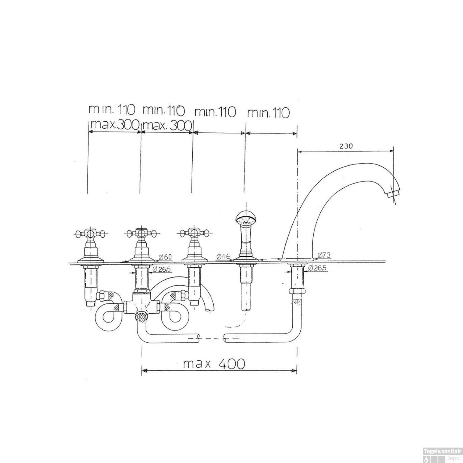 Specificaties Badrandkraan 3-kruisgreep Mengkraan Compleet 5-gats Goud Sapho Antea: