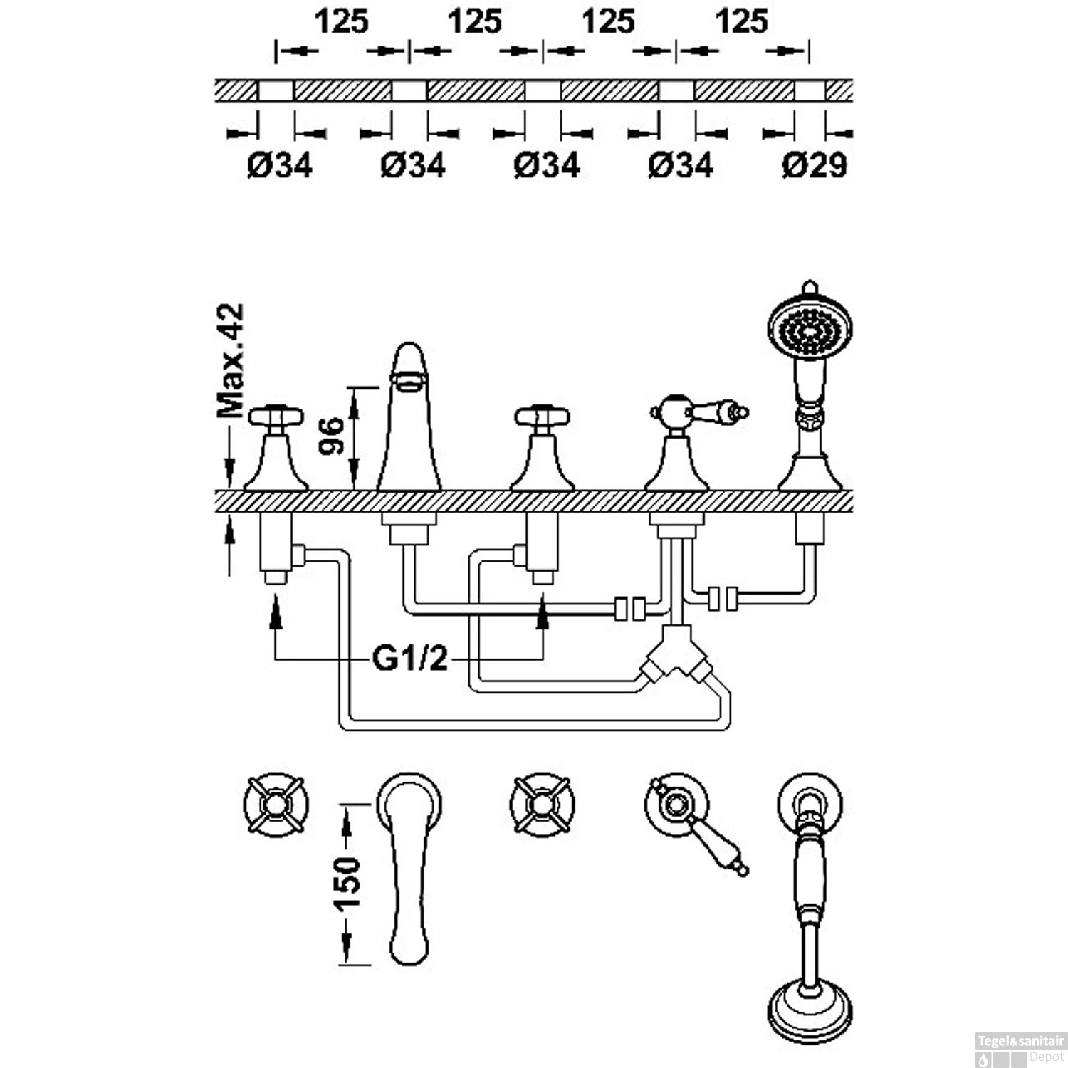 De mooie klassieke afbouwset is een 5-gats badmengkraan. Deze bevat twee kruisgrepen waarmee de temperatuur geregeld kan worden. De kraan heeft een uitloop van 15.1 cm en de handdouche is voorzien van antikalk sproeigaatjes waardoor deze makkelijk schoon te maken is.