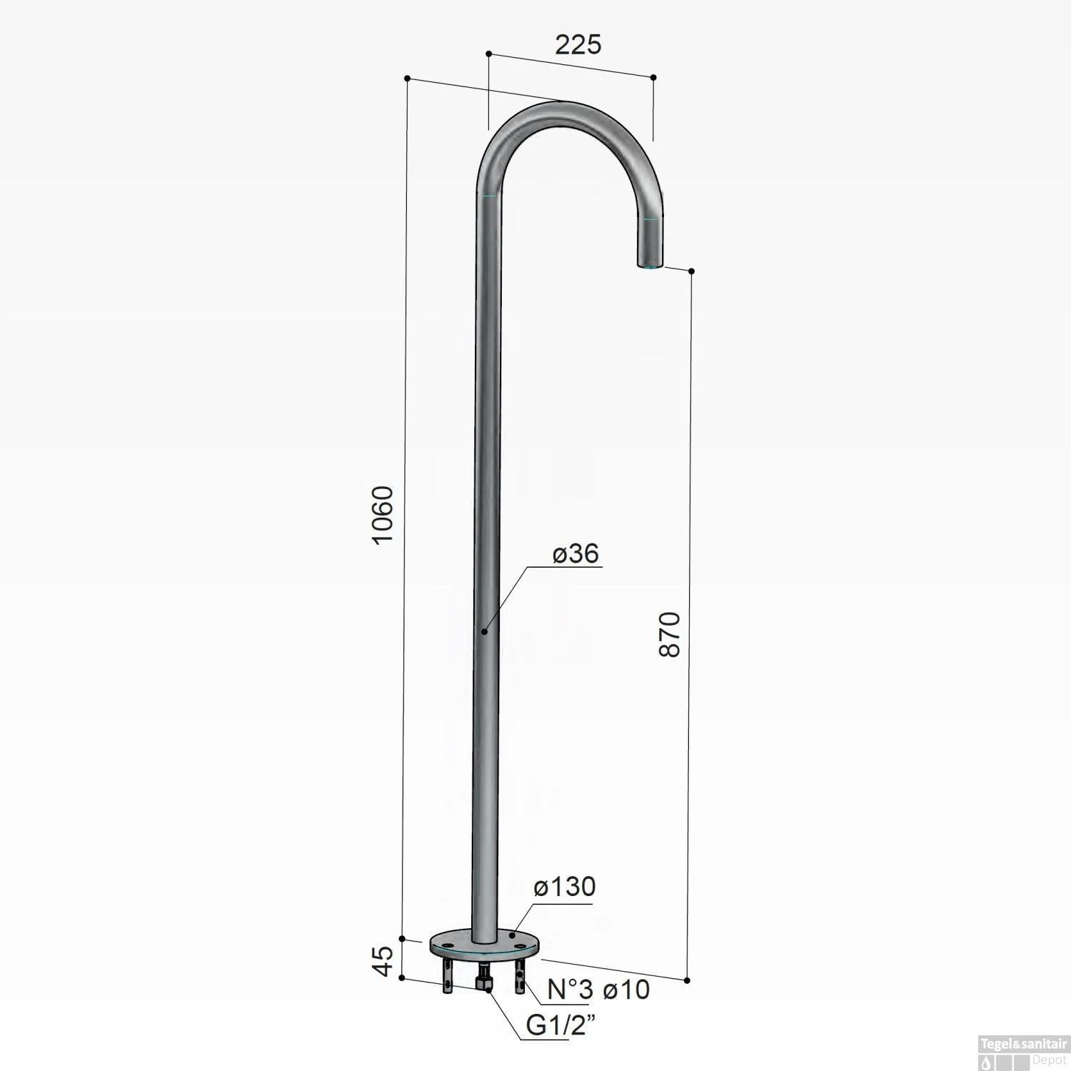 De kraan is geschikt voor vrijstaande baden en zorgt voor een luxe uiterlijk. De hoogte is 106 cm met een diepte van 22.5 cm. De hoogte van de uitloop is 87 cm. Let op bij de aansluiting van 1/2″ dient het buitendraad in de vloer geplaatst te worden. De diameter van de uitloop is 3.6 cm. Let op: dit is slechts de uitloop, u dient de kraan los bij te bestellen voor een meerprijs, dit is mogelijk onder aan de pagina.