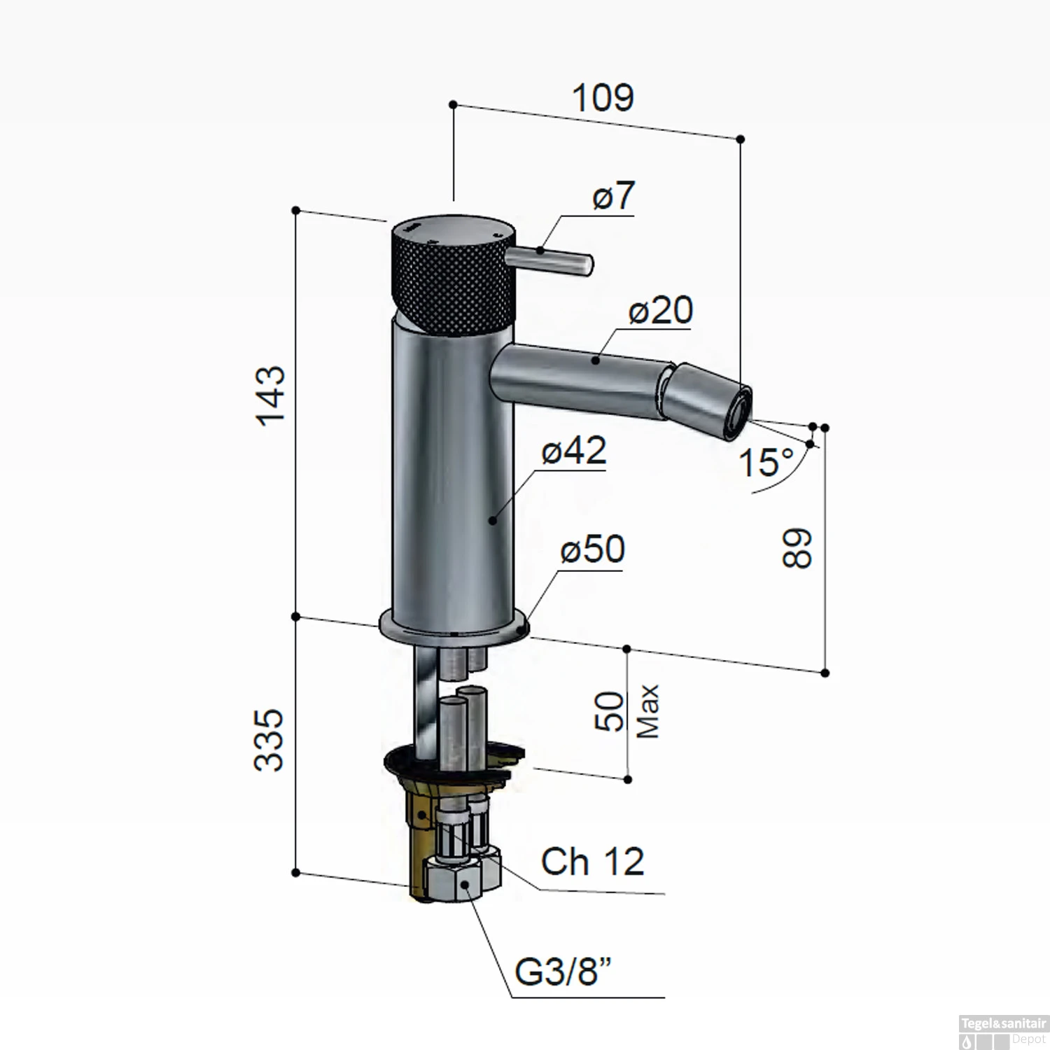 De kraan heeft een hoogte van 14.3 cm en een diepte van 10.9 cm. De kraan wordt geleverd zonder waste. De diameter van de kraan is 4,2 cm.