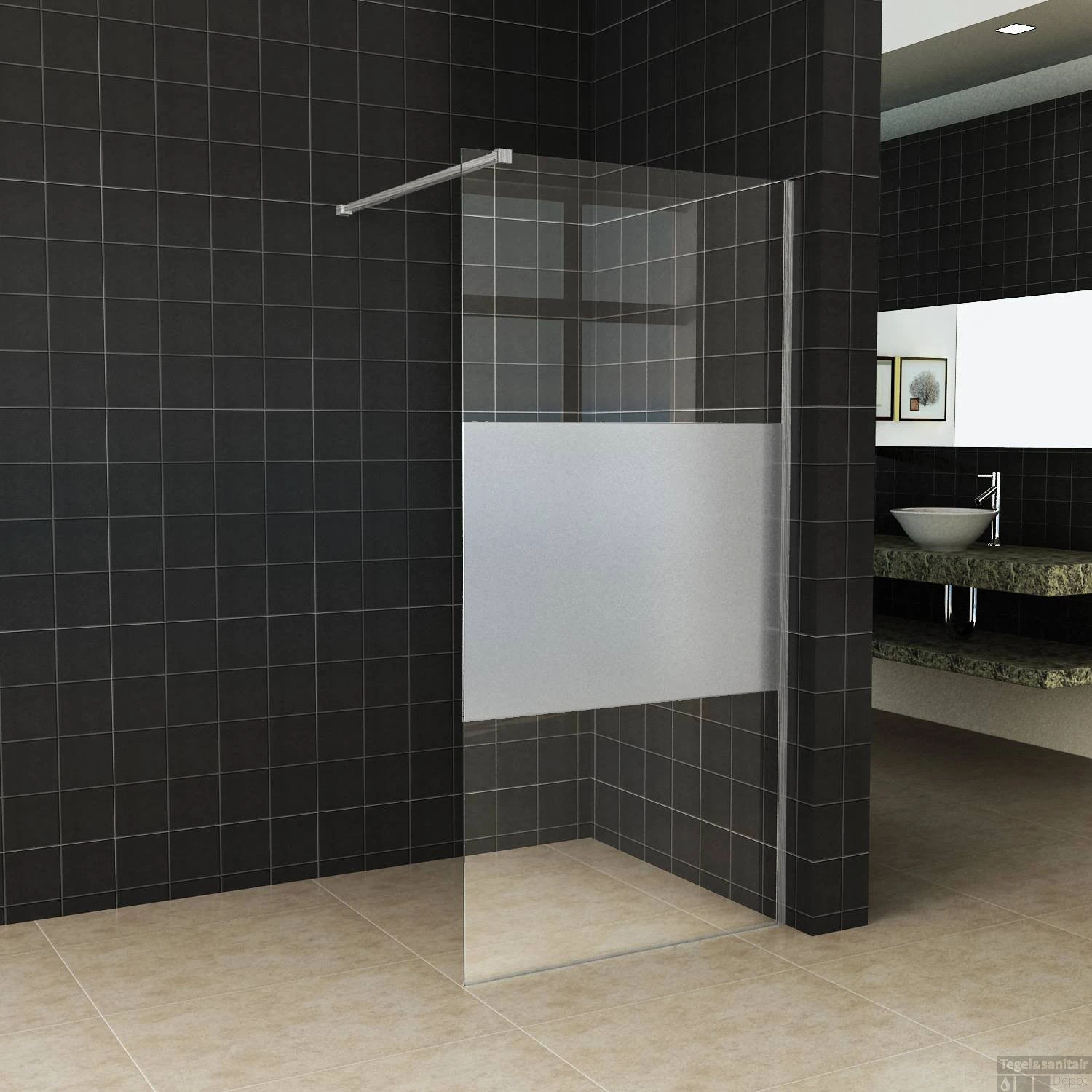 Deze inloopdouche heeft een schaamband, ook wel middenband genoemd. Als u wat extra privacy wenst dan is de inloopdouche met een middenband ideaal. Het is niet alleen bedoeld als “schaamband”, maar het matglas geeft uw badkamer ook meteen een hele ander look. Doordat het glas wordt gezandstraald krijgt u een matte, niet doorkijkende laag.