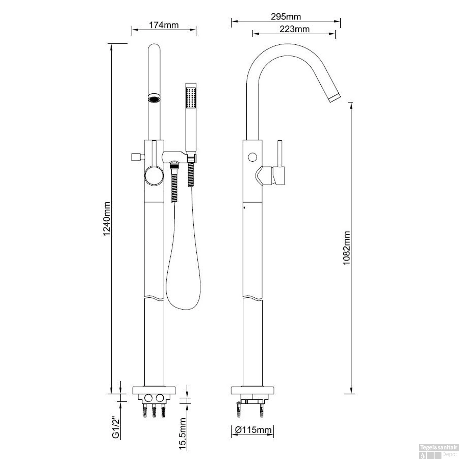 Specificaties BWS Vrijstaande Badmengkraan Round met Handdouche Geborsteld Staal: