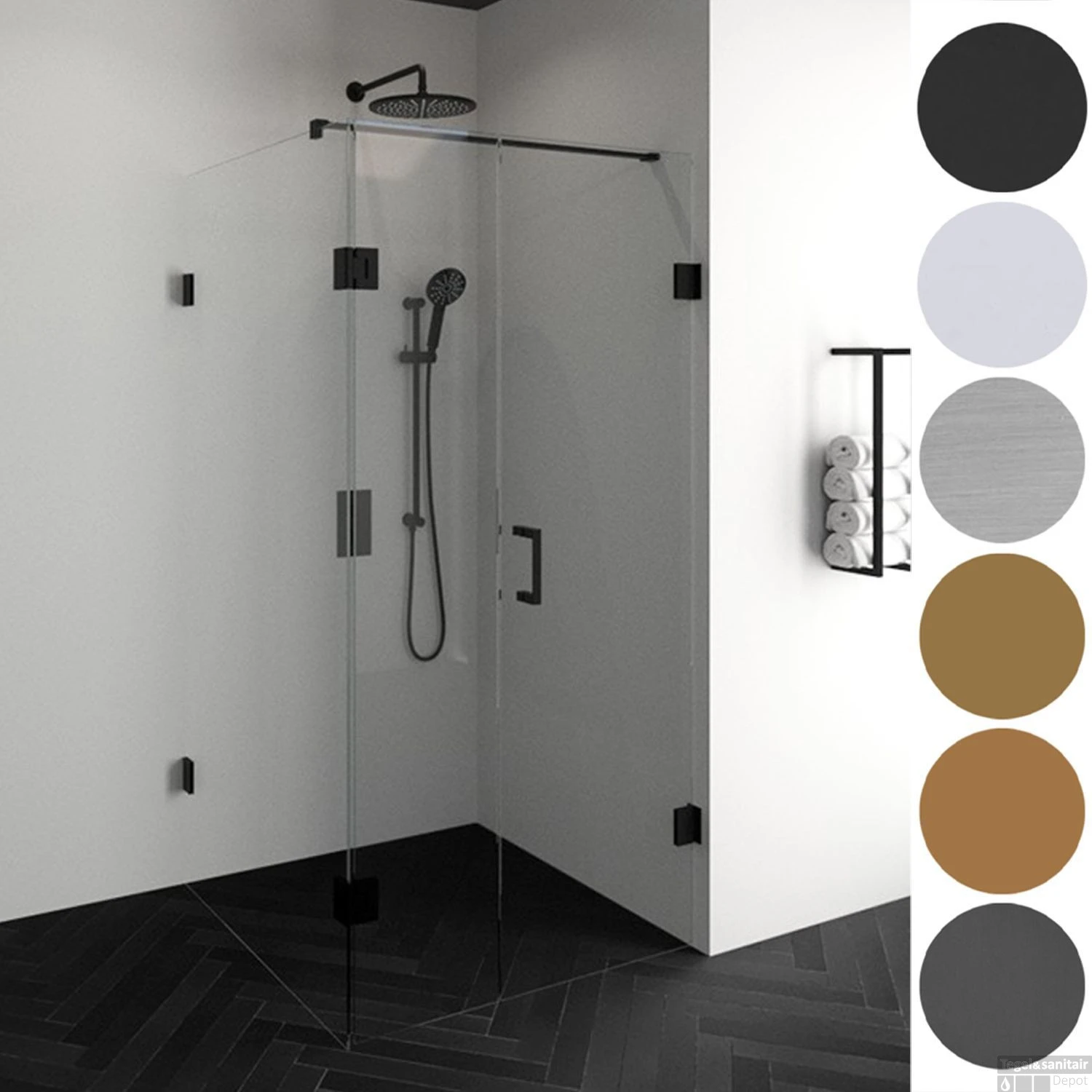 U heeft de mogelijkheid om uit zes verschillende kleuren beslag te kiezen, waardoor u uw douchecabine moeiteloos kunt aanpassen aan het design van uw badkamer. Chroom, Geborsteld RVS, Mat Zwart, Goud, Gunmetal of Koper beslag? Bekijk de diverse mogelijkheden en pas dit toe in uw badkamer. De douchecabines zijn verkrijgbaar in de volgende kleuren en maten: