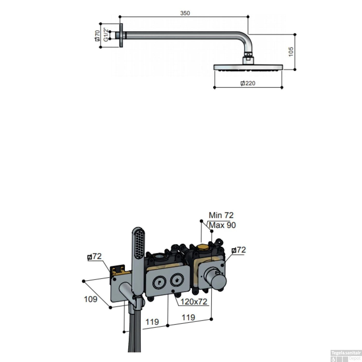 Specificaties Complete Thermostatische Regendouche Hotbath Gal IBS41 Inbouwset Met 2 Stopkranen: