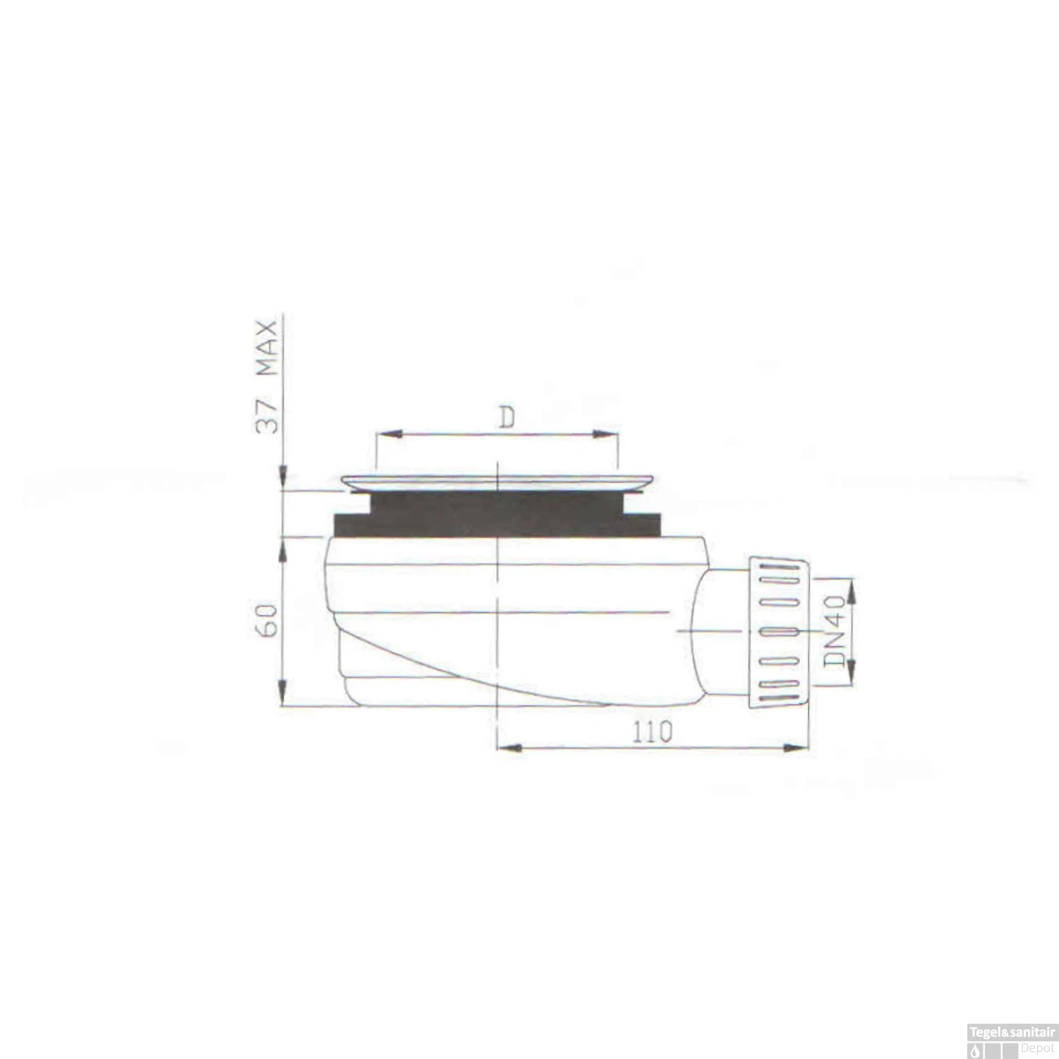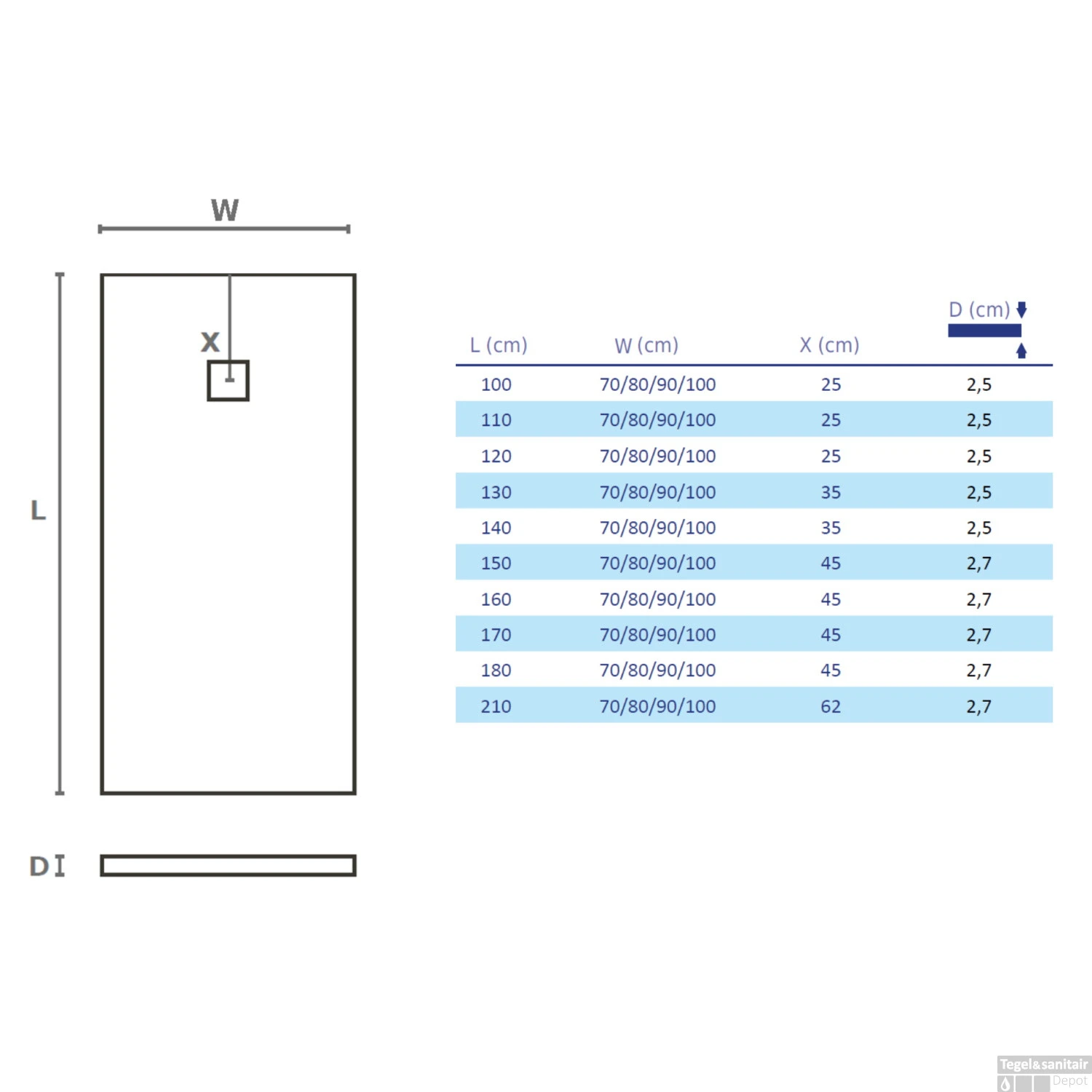 - De locatie van de afvoer verschilt per afmeting. (zie technische tekening)