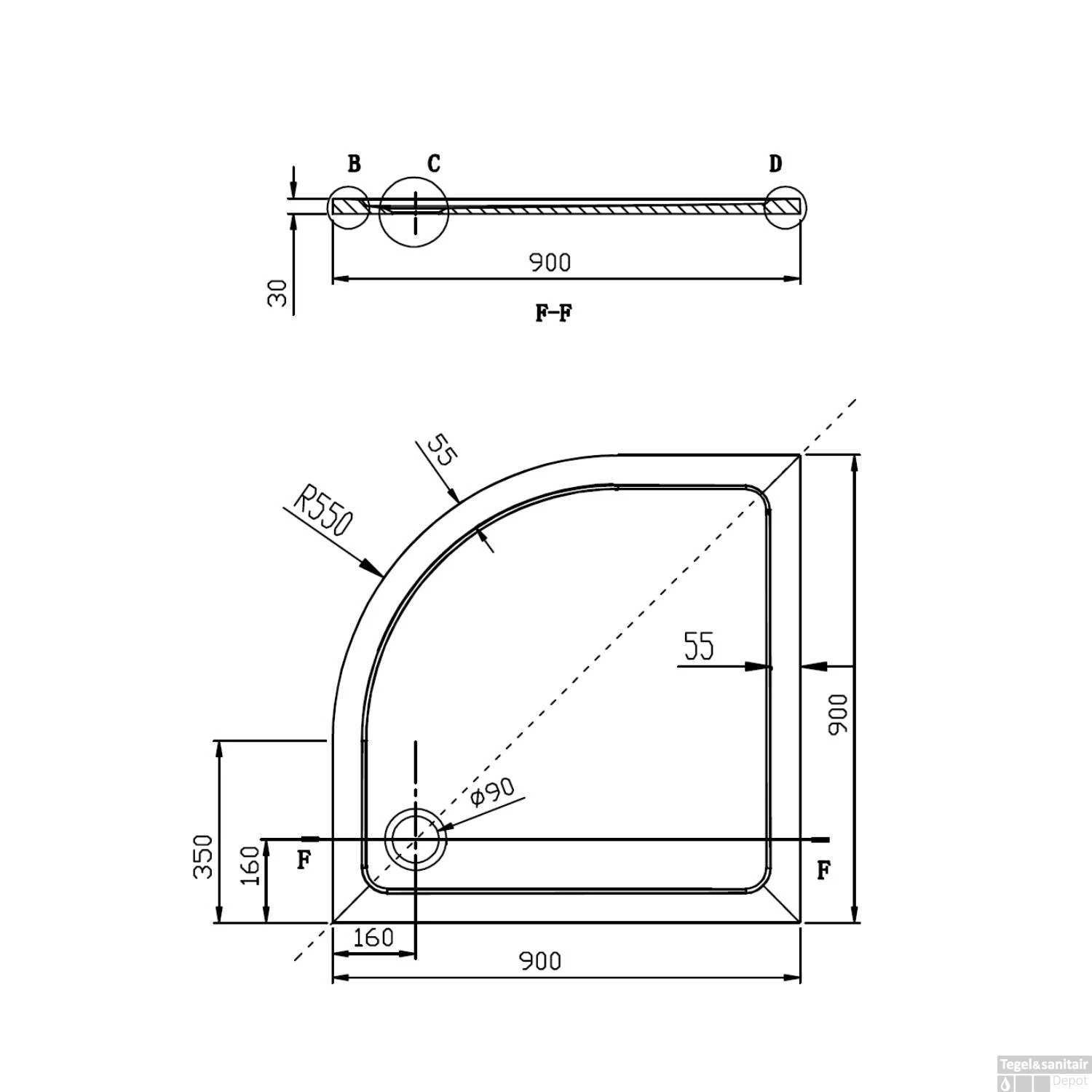 Specificaties Douchebak Gegoten Marmer 90x90x3 cm Kwartrond Wit Sapho Aqualine:
