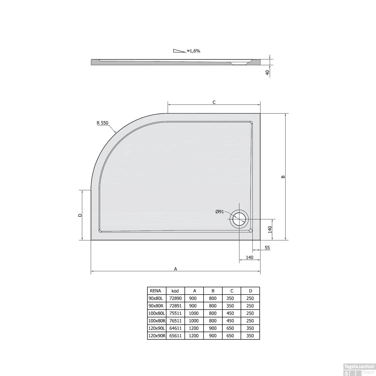 Specificaties Douchebak Gegoten Marmer 100x80x4 cm Kwartrond Rechts Wit Sapho Rena: