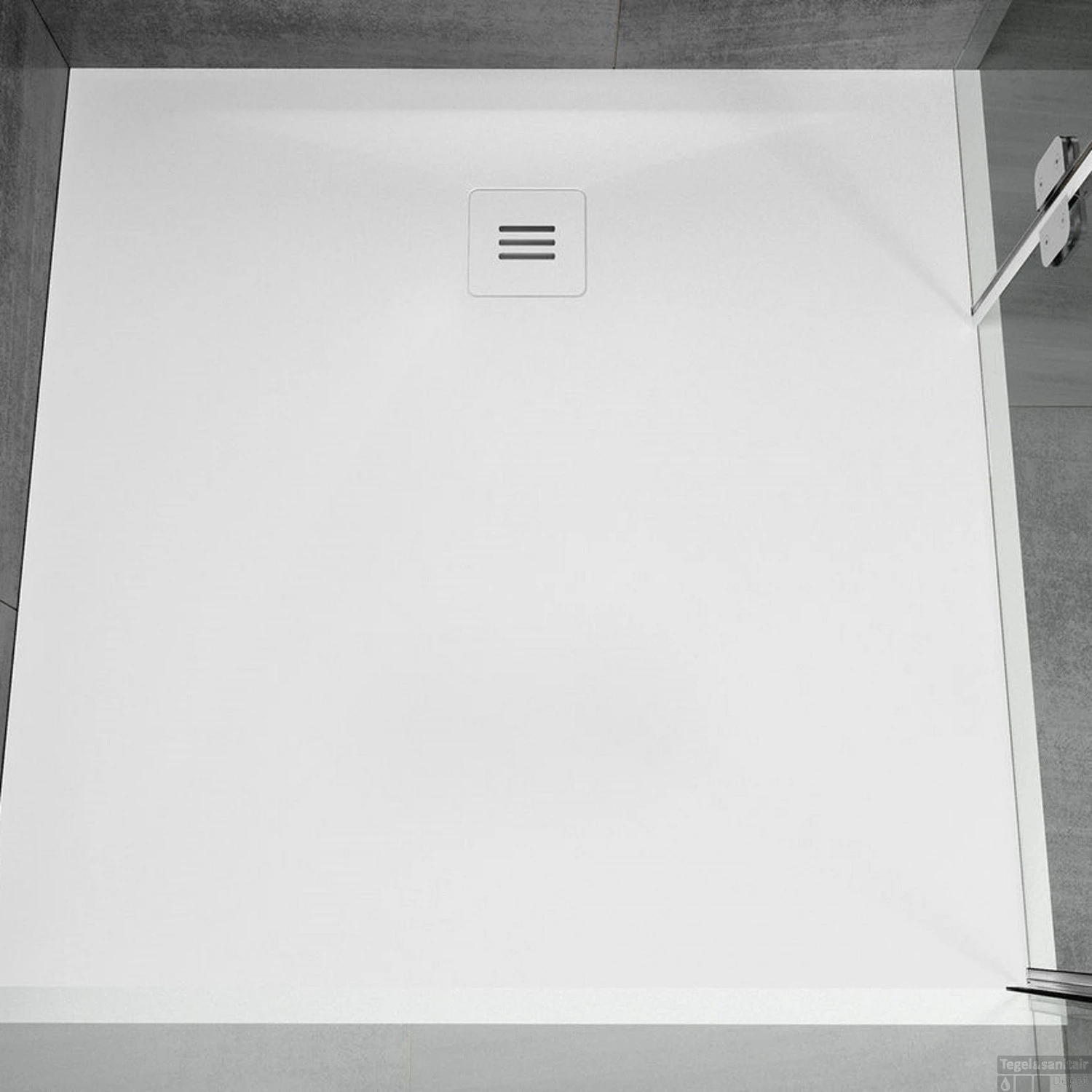 De douchebak wordt niet geleverd met poten, maar kan wel direct op of in de douchevloer geplaatst worden. De douchebak is gemaakt van solid surface en afgewerkt in mat wit.
