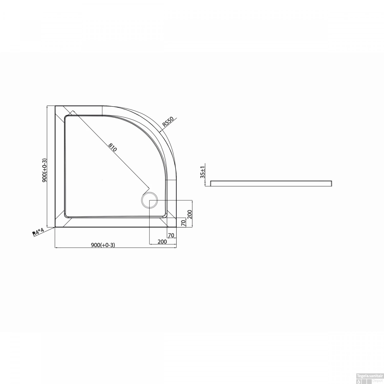 De kwartronde douchebak is voorzien van een afvoergat met een diameter van 90mm aan de zijkant van de douchebak. Er wordt geen afvoer meegeleverd. Is makkelijk te installeren.