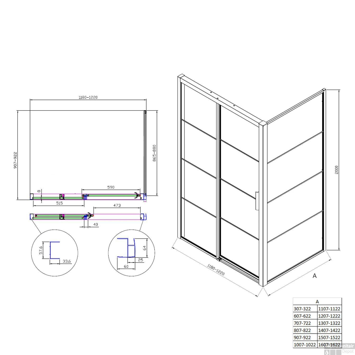Specificaties Douchecabine Boss & Wessing Frame met Schuifdeur en Vaste Wand: