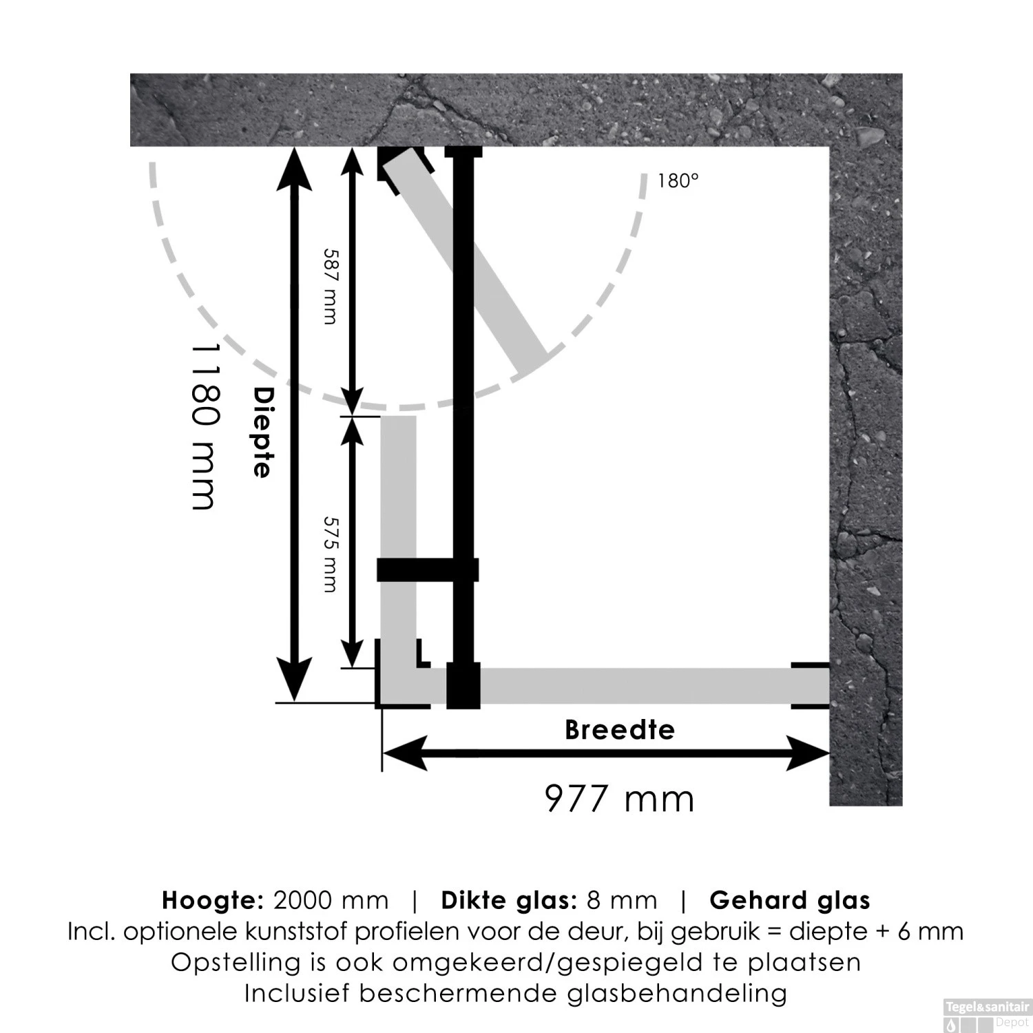 Deze complete douchecabine bestaat uit een inloopwand, zijwand en draaideur en Goud beslag. Inclusief glasbehandeling en optionele kunststof profielen. De hoogte van de douchecabine is 200 cm. De cabine is 97,7 cm breed en 118 cm diep. Deze douchecabine straalt luxe uit door zijn design en kleur.