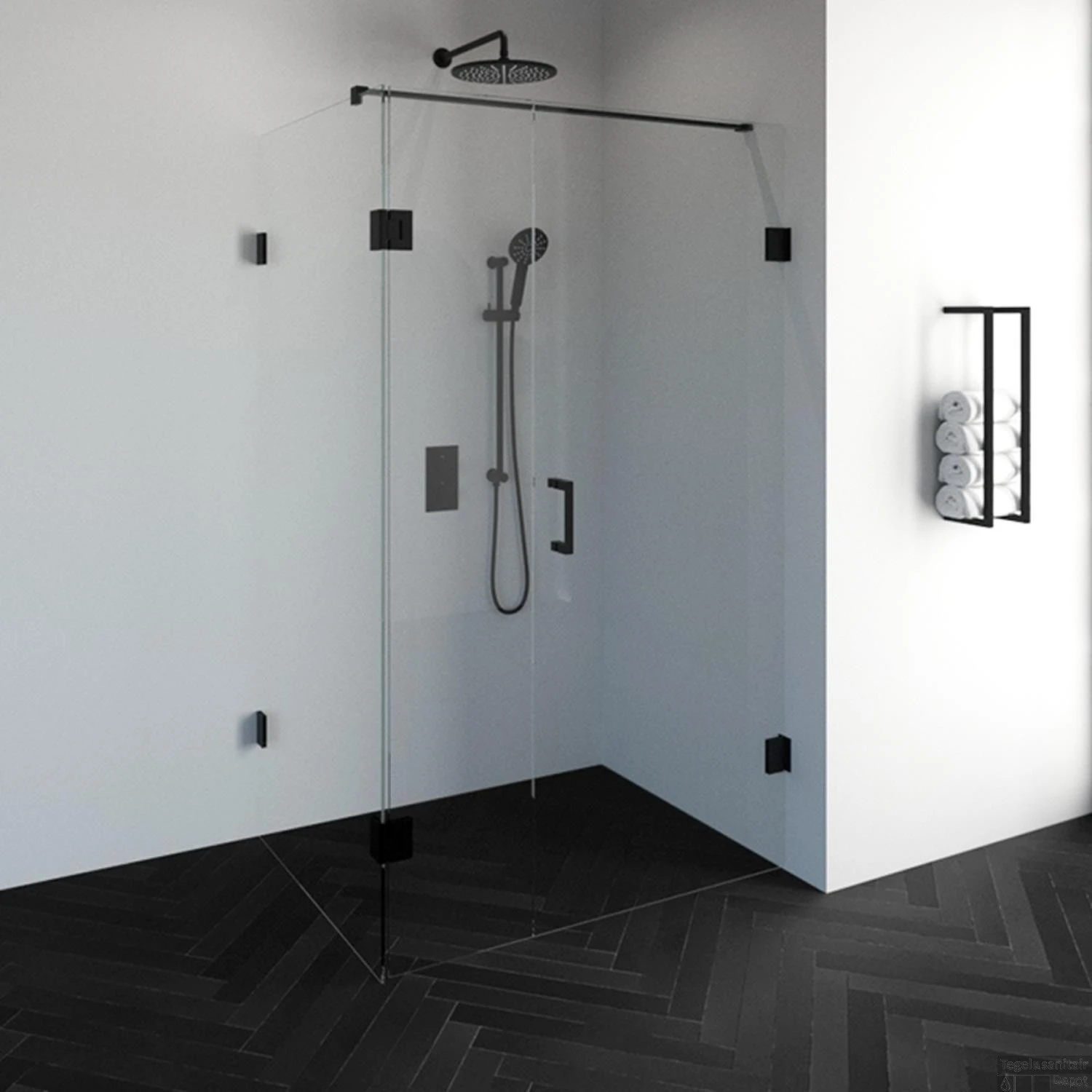 Deze complete douchecabine bestaat uit een inloopwand, draaibare zijwand en draaideur met mat zwart beslag. Inclusief glasbehandeling en optionele kunststof profielen. De hoogte van de douchecabine is 200 cm. De cabine is 87,7 cm breed en 118,8 cm diep. Deze douchecabine straalt luxe uit door zijn design en kleur.