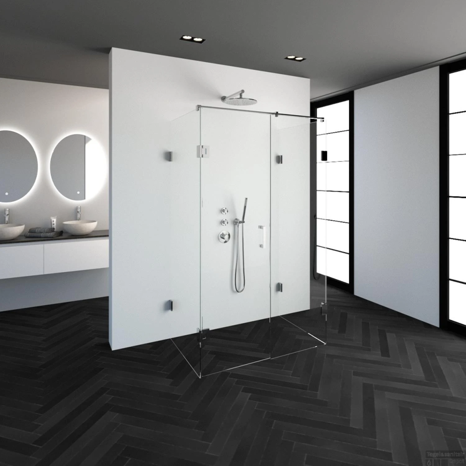 Deze complete douchecabine bestaat uit twee inloopwanden gekoppeld 80 cm, één inloopwand gekoppeld 60 cm en een draaideur 60cm met chroom beslag. Inclusief glasbehandeling en optionele kunststof profielen. De hoogte van de douchecabine is 200 cm. De cabine is 118,8 cm breed en 77,7 cm diep. Deze douchecabine straalt luxe uit door zijn design en kleur.