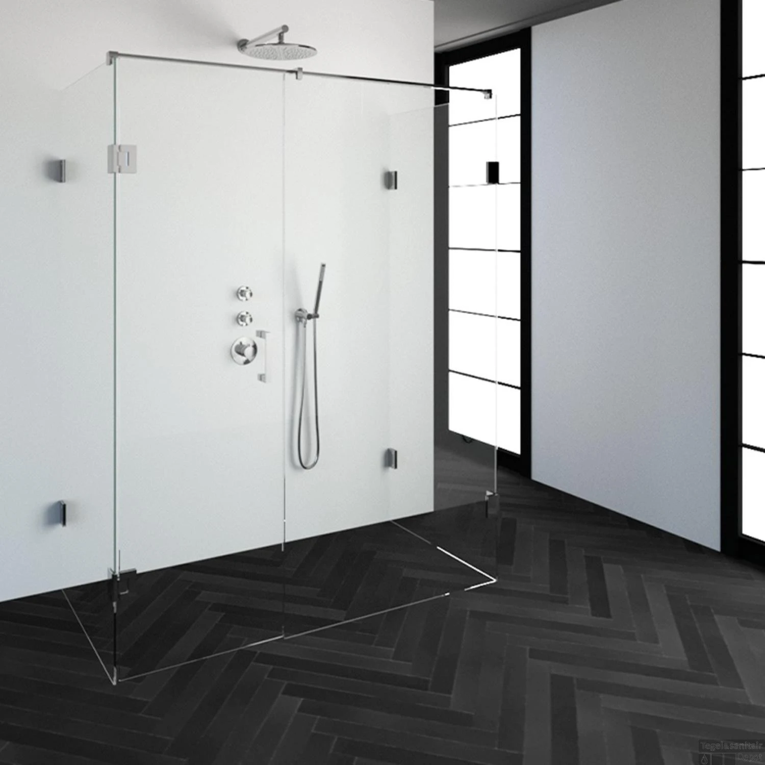 Deze complete douchecabine bestaat uit twee inloopwanden gekoppeld 80 cm, één inloopwand gekoppeld 60 cm en een draaideur 60cm met chroom beslag. Inclusief glasbehandeling en optionele kunststof profielen. De hoogte van de douchecabine is 200 cm. De cabine is 158,8 cm breed en 77,7 cm diep. Deze douchecabine straalt luxe uit door zijn design en kleur.