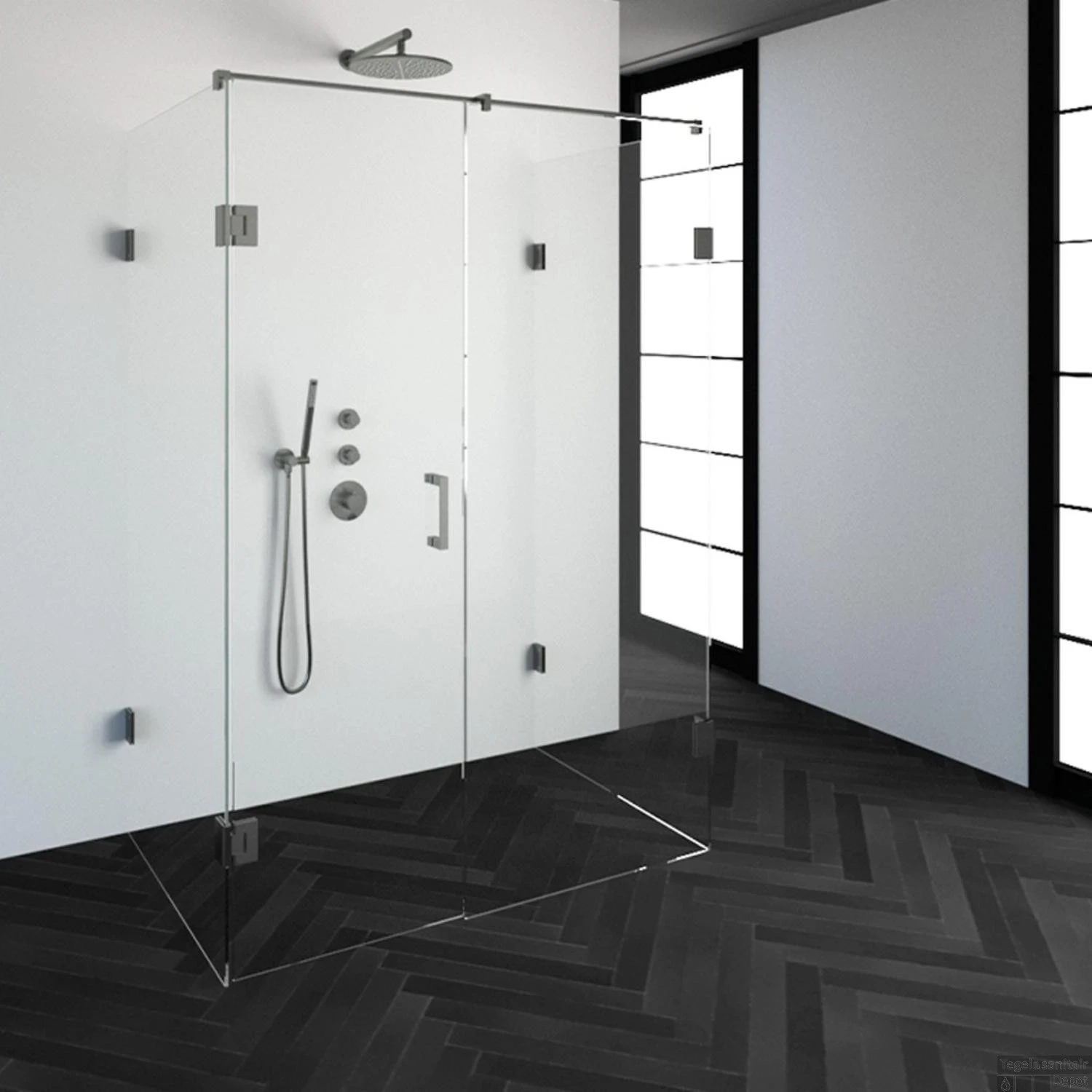 Deze complete douchecabine bestaat uit twee inloopwanden gekoppeld 90 cm, één inloopwand gekoppeld 60 cm en een draaideur 60cm met RVS beslag. Inclusief glasbehandeling en optionele kunststof profielen. De hoogte van de douchecabine is 200 cm. De cabine is 138,8 cm breed en 87,7 cm diep. Deze douchecabine straalt luxe uit door zijn design en kleur.