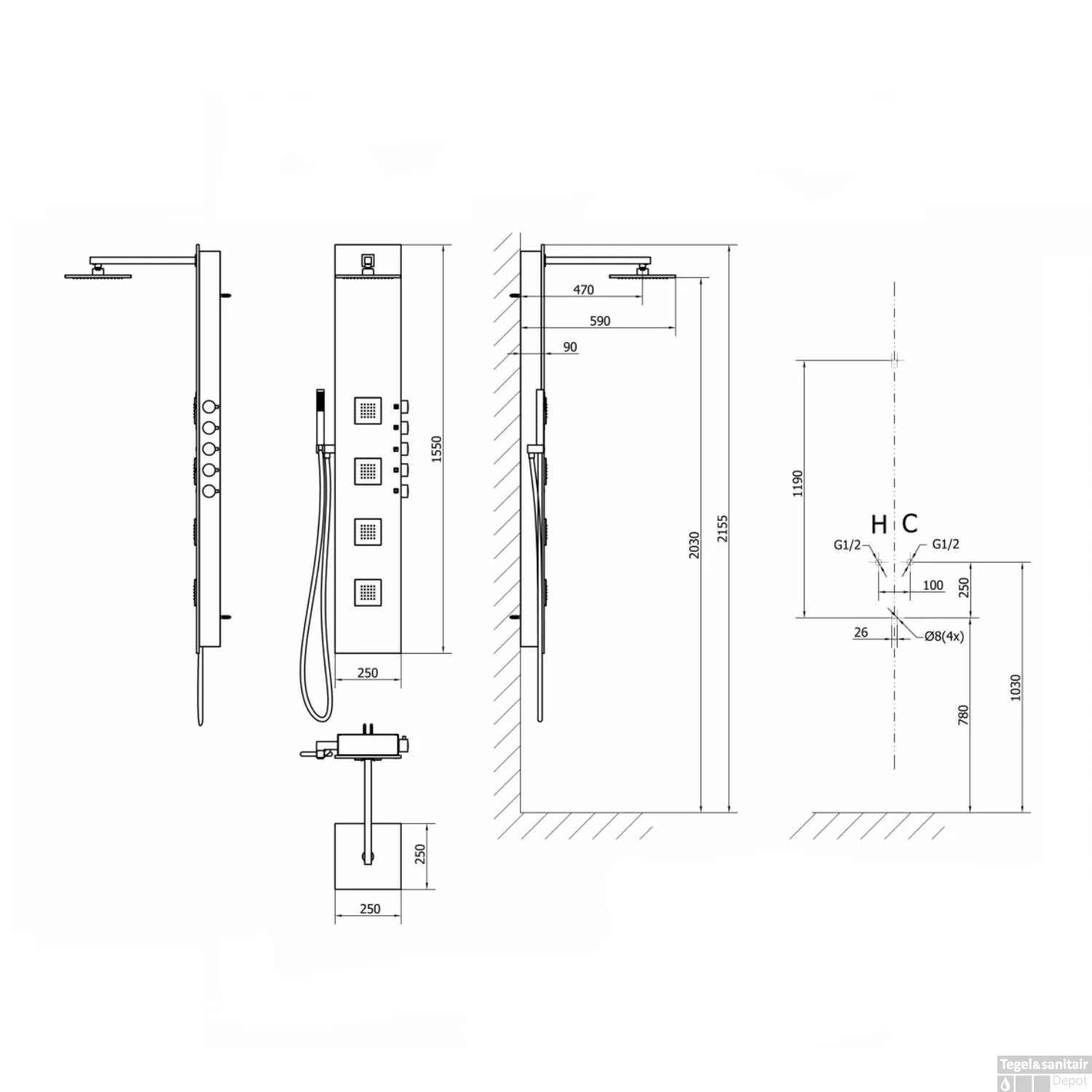 Specificaties Douchepaneel 155×25 cm Mengkraan Vierkant Wit Sapho 5Side: