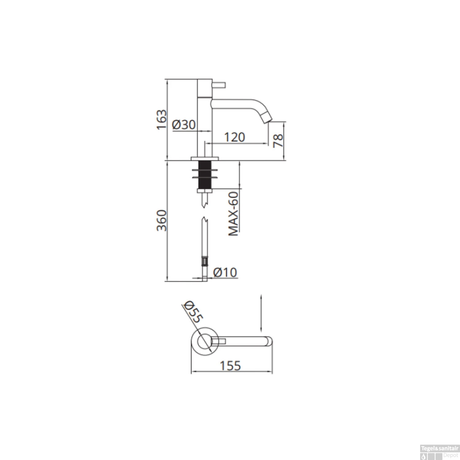 De kraan is 15.5 cm diep en is gemaakt van messing.