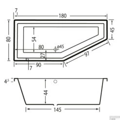 Het bad is 180cm lang en 80cm breed, genoeg om gezellig met zijn tweeën in te zitten. De afvoer zal niet in de weg zitten want die zit netjes in het midden. De rand van het bad is 3.5cm breed. Er zit overigens een bad afvoer bij het bad voorzien van een chromen click waste, sifon met flexibele afvoerpijp van 40mm. (Sifon steekt er niet onderuit.) Is daarnaast voorzien van een overloop.