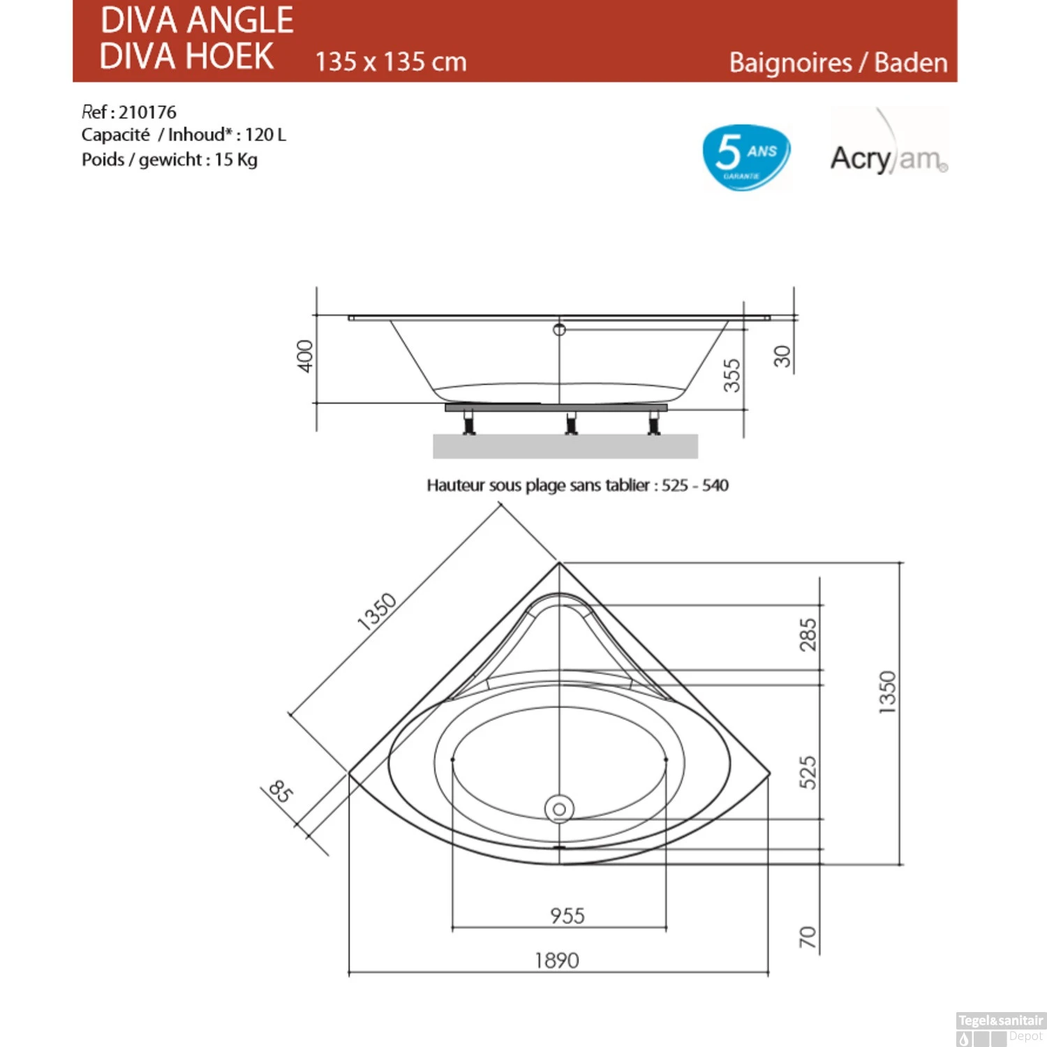 Met het Hoekbad Allibert Diva Kwartrond 135×135 cm kunt u helemaal tot rust komen. Dankzij het grote berg oppervlak staan al uw producten binnen bereik en biedt het dus veel comfort. De afmetingen van dit bad zijn Lengte: 135 cm de Breedte 135 cm en de Diepte: 40 cm. Het volume van dit bad is 115-185 Liter.