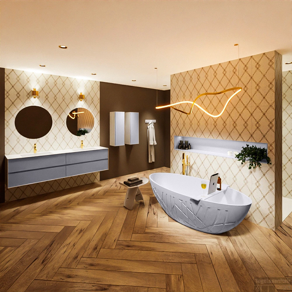 Het bad heeft een mooi ovale vorm en met de 3D reliëf aan de buitenzijde past dit bad perfect in iedere badkamer. De opstelling Holm is gecombineerd met het badmeubel en kolomkasten van de serie FINE. Dit badmeubel heeft rondom Solid Surface wat naadloos verlijmd wordt met een wastafel naar keuze. Gecombineerd met massief eiken fronten in de 2kleuren of in 14 kleuren MDF fronten.