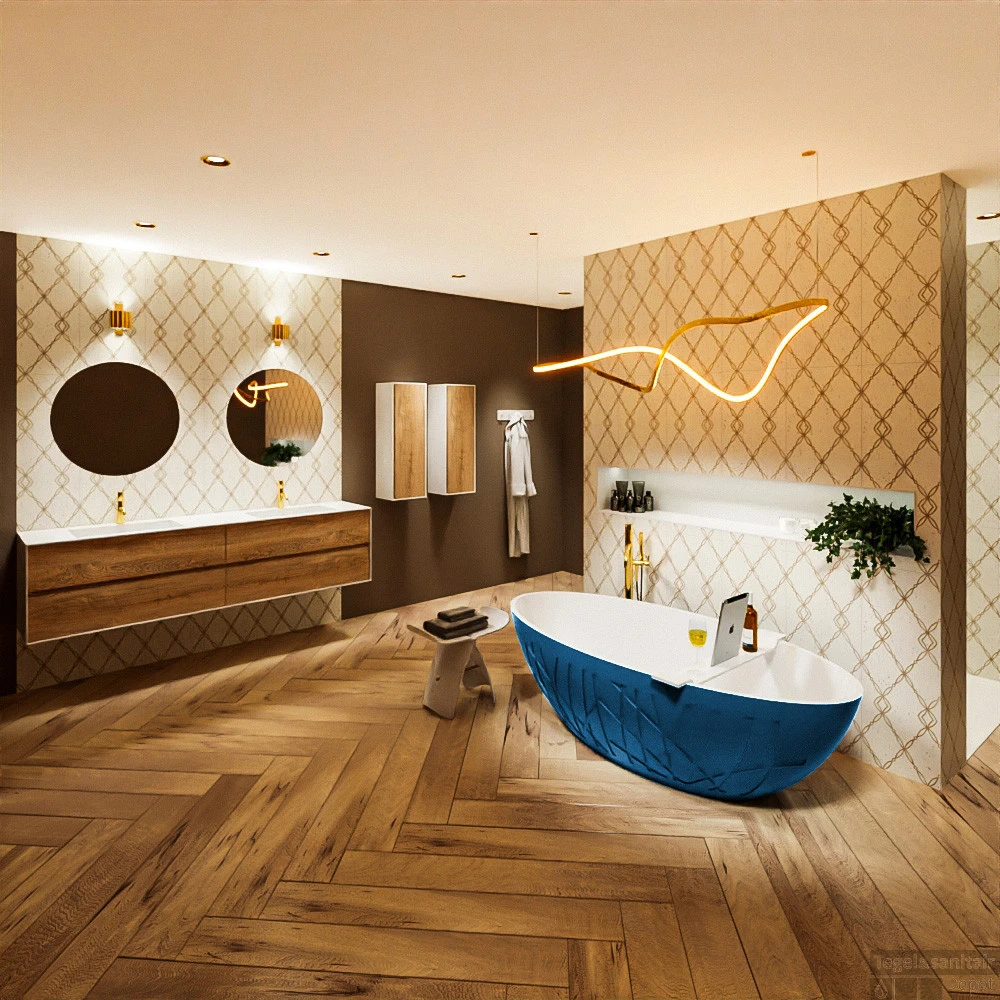 Het bad heeft een mooi ovale vorm en met de 3D reliëf aan de buitenzijde past dit bad perfect in iedere badkamer. De opstelling Holm is gecombineerd met het badmeubel en kolomkasten van de serie FINE. Dit badmeubel heeft rondom Solid Surface wat naadloos verlijmd wordt met een wastafel naar keuze. Gecombineerd met massief eiken fronten in de 2kleuren of in 14 kleuren MDF fronten.
