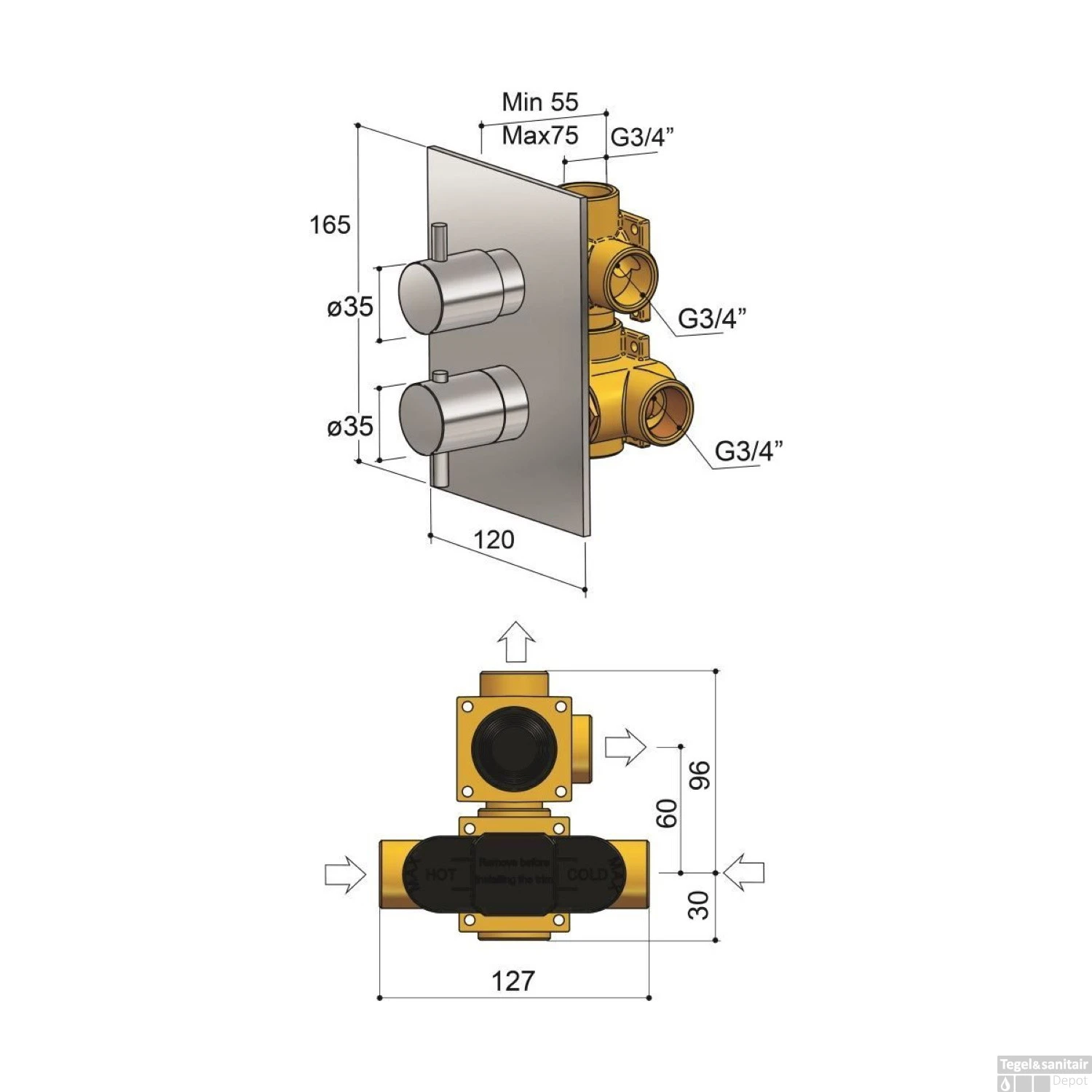 Specificaties Inbouw Douchekraan Hotbath Laddy Thermostatisch 2-Weg Stop-Omstel Vierkant Chroom: