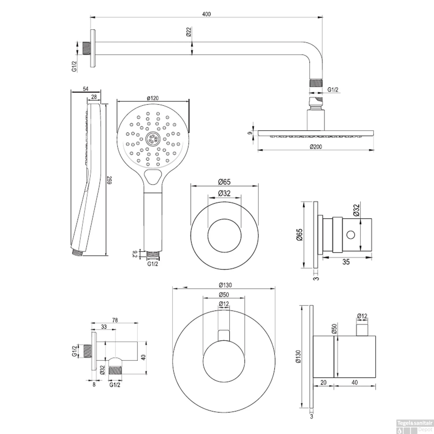 - Afmeting hoofddouche: 30 cm