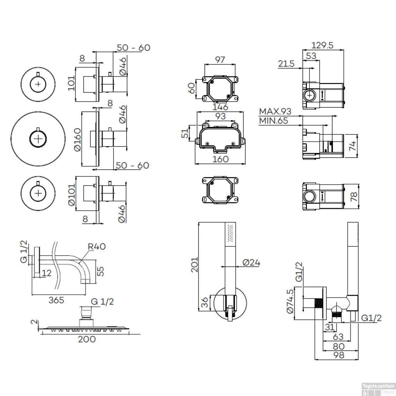 Specificaties Inbouw Thermostatische Regendoucheset Lagoo Garda met 2 Stopkranen en Handdouche Gunmetal: